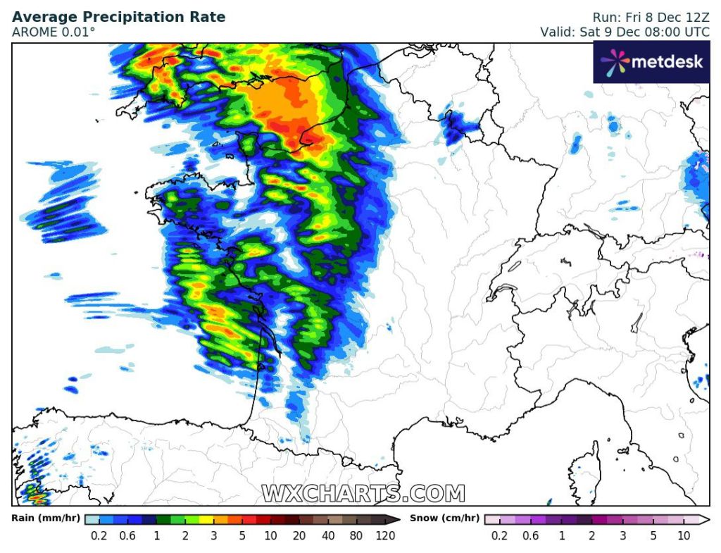Après-midi : La perturbation progresse vers l’est en donnant toujours des pluies modérées et des vents de sud-ouest à 60-70 km/h en rafales. Les rafales de vent seront plus importantes en montagne notamment sur le Massif Central. Le ciel s’ennuagera dans le sud-est et en Corse à l’avant. A l’arrière, c’est un ciel variable qui s’installera par le nord-ouest avec un risque d’averses notamment en Normandie. Le vent d’ouest soufflera jusqu’à 90 km/h sur les côtes de la Manche.