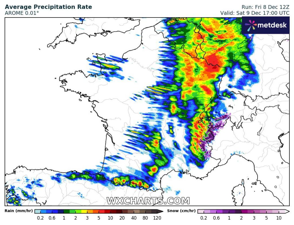 En soirée, il neigera à haute altitude sur les Alpes, à plus de 2200-2400 m. La pluie tombera en dessous ce qui sera néfaste pour la couverture neigeuse.