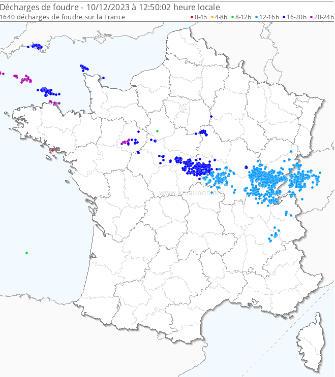 Hier soir, la Franche Comté notamment a été prise au dépourvue avec des orages parfois forts qui se sont produits notamment fortes pluies, grêle abondante et violentes rafales de vent à son passage. L’activité électrique a été remarquable pour un 9 décembre avec peu plus de 1600 éclairs relevés. Un axe région Centre – Franche Comté est bien identifié.