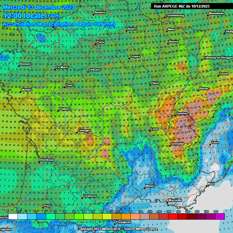 D’ici mercredi midi, il est probable que les cumuls de pluie atteignent les 200 mm notamment entre Haute Savoie et Savoie. Gros cumuls aussi mais à degré moindre sur l’ouest du Massif Central et le Jura.