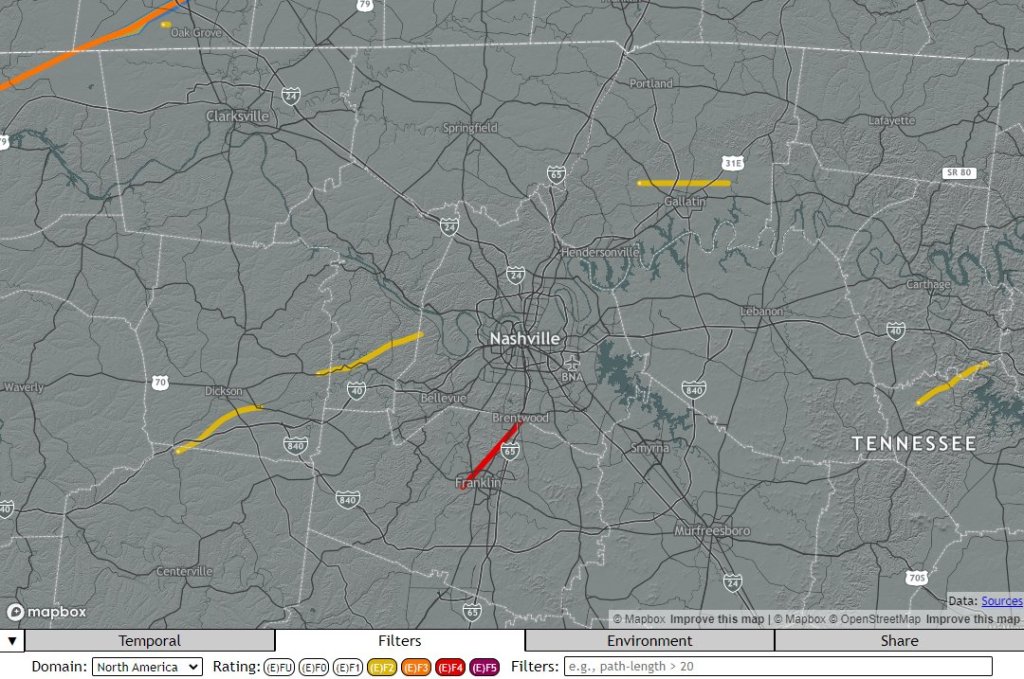 25 reports de tornades à signaler il y a quelques heures entre les Etats du Mississippi, Alabama, Floride, Tennessee et Kentucky. Ces tornades ont été dévastatrices particulièrement entre Tennessee et Kentucky. Les villes de Clarksville et Nashville ont été concernées de très près.