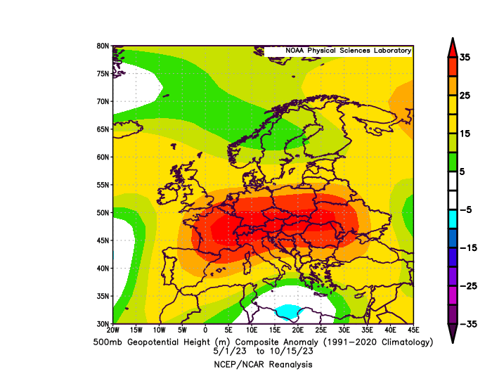 Sur l’été 2023 et la première moitié de l’automne 2023, les situations anticycloniques ont très souvent prédominé notamment entre le 15 août et le 15 octobre. Depuis le 15 octobre environ, changement complet avec une circulation dépressionnaire parfois intense à notre latitude jusqu’à l’Europe de l’est. Si bien qu’on passe d’un extrême à l’autre, d’une situation à très peu de précipitations à une situation avec beaucoup de précipitations (parfois trop même!).