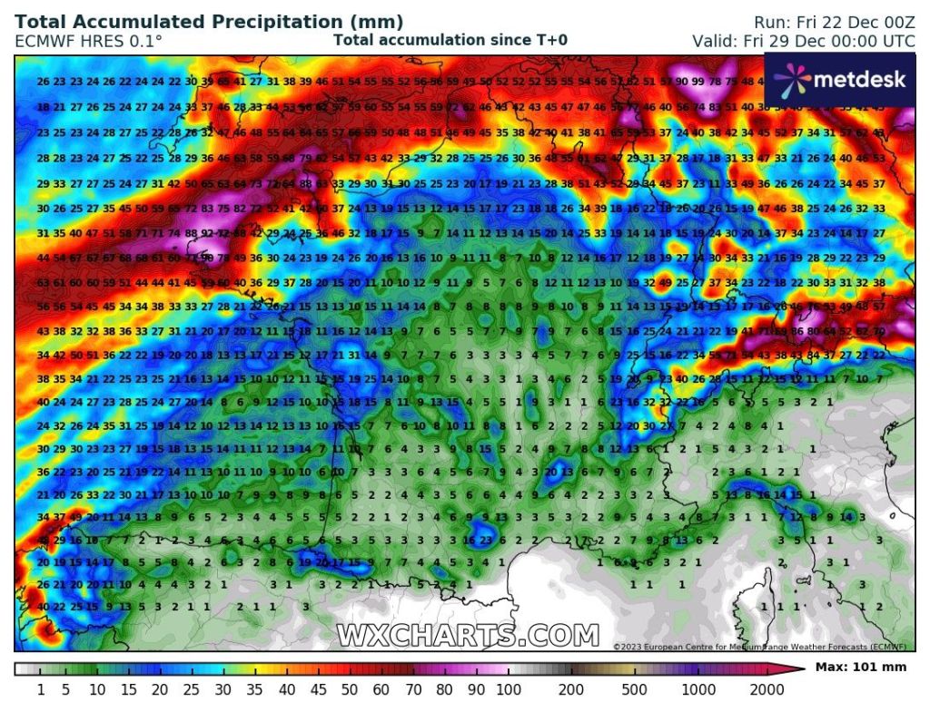 Pour les précipitations jusqu’à 7 jours (carte présentée à titre indicatif – cumuls à ne pas prendre au pied de la lettre), l’on voit qu’on sera globalement contourné par les perturbations avec de cumuls surtout conséquents pour le Bretagne et l’extrême nord.
