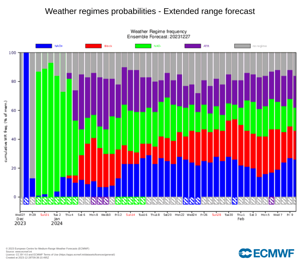 Le WRP européen associé à la sortie quotidienne du modèle européen entrevoyant la tendance à plusieurs semaines, insiste sur un régime de temps dominant entre dorsale anticyclonique atlantique et oscillation nord atlantique négative pour la semaine du 8 janvier. Cela pourrait nous amener à une semaine froide sans excès avec de l’humidité à la clé plus au sud ce qui pourrait être une bonne nouvelle pour le pourtour méditerranéen qui a tellement besoin d’eau. C’est à suivre car c’est encore loin en échéance, donc loin d’être certain mais les modélisations se suivent et se ressemblent dans ce sens avec un signal repris.