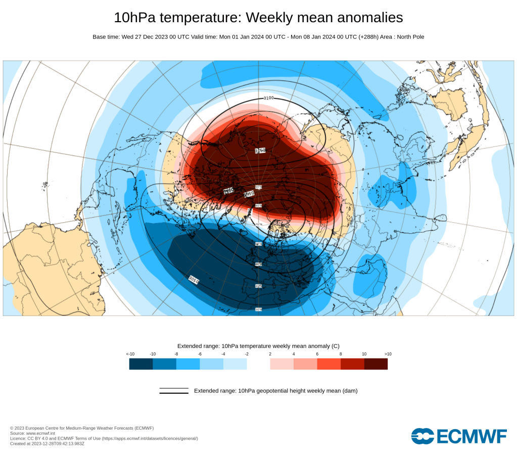 Un réchauffement stratosphérique important est toujours entrevu entre le 5 et 10 janvier avec possible diffusion dans la troposphère. Cela pourrait avoir une influence importante sur le temps à l’échelle de l’hémisphère nord pour les semaines suivantes y compris février. Des descentes froides pourraient atteindre les latitudes moyennes de l’hémisphère nord sans qu’on puisse dire à ce jour où. Dans ces configurations, le nord de l’Europe et l’est du continent américain sont souvent bien placés.
