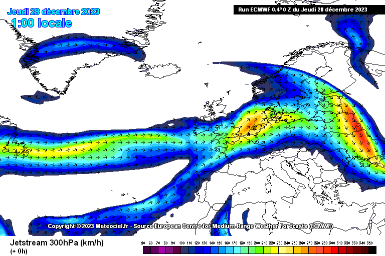 Cette modélisation du modèle Européen représentant le courant jet à 300 hPA est intéressante, car elle montre qu’à partir de ce week-end le courant jet devrait s’abaisser davantage en latitude pour venir percuter pleinement le pays la semaine prochaine.