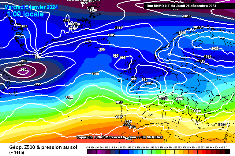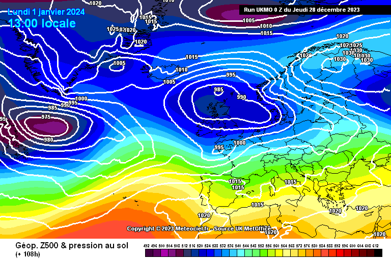 Le modèle anglais UKMO montre bien que ce soit lundi 1er janvier et mercredi 3 janvier des potentiels coups de vent avec la circulation de minimums dépressionnaires secondaires.