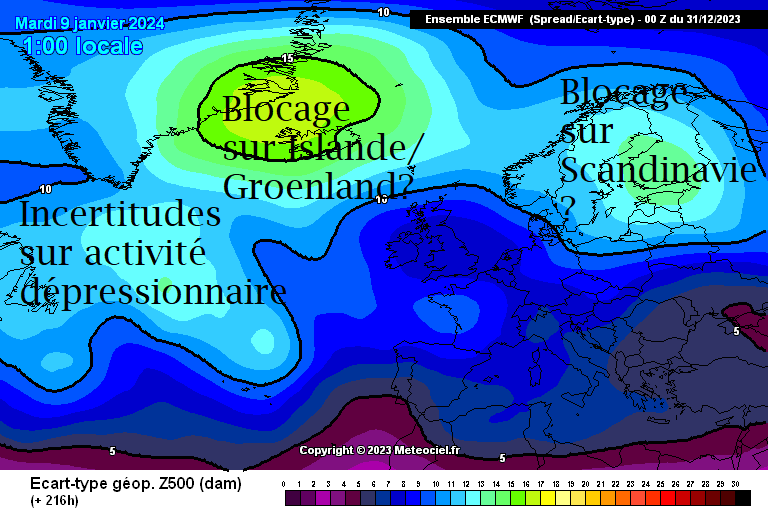 L’évolution de cette dorsale anticyclonique est mal cernée par la suite ce qui est encore une fois tout à fait normal étant donné l’échéance bien lointaine. Elle pourrait éventuellement s’étirer vers le Groenland ou vers la Scandinavie. Cela dépend intimement aussi de l’activité dépressionnaire en sortie du continent américain qui influera sur le comportement de cette dorsale. A cette échéance, les modélisations sont grossières et appréhendent mal le comportement des dépressions de surface. Donc il convient d’attendre pour en savoir plus.