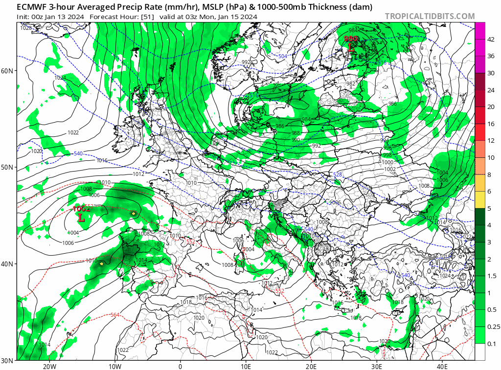 Lundi et mardi, une masse d’air plus douce envahira le quart sud-ouest du pays avec le passage d’une perturbation à la clé lundi donnant des pluies dans le sud-ouest. La limite pluie-neige remontera au dessus de 2000 m dans les Pyrénées ce qui préfigure malheureusement d’un lessivage en dessous. Le froid résistera bien au nord d’une ligne La Rochelle – Grenoble avec des gelées matinales encore nombreuses et des températures restant basses l’après-midi souvent guère plus de 1 à 5°C. Mardi en fin de journée, une nouvelle perturbation arrivera par le sud-ouest préfigurant probablement d’un conflit de masses d’air mercredi.