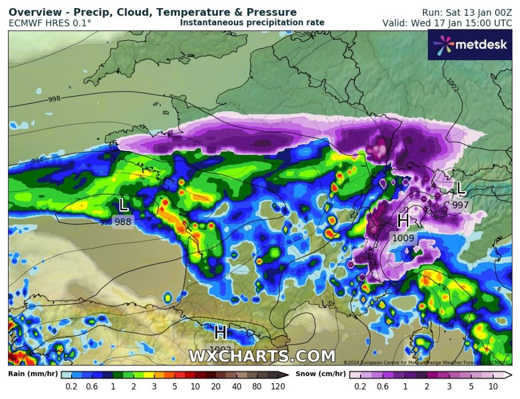 Le modèles de l’IA les plus performants, ont tendance à suivre cette tendance à voir directement la Normandie, l’Ile de France et le Grand Est impactés par des chutes de neige possiblement abondantes et des pluies verglaçantes.