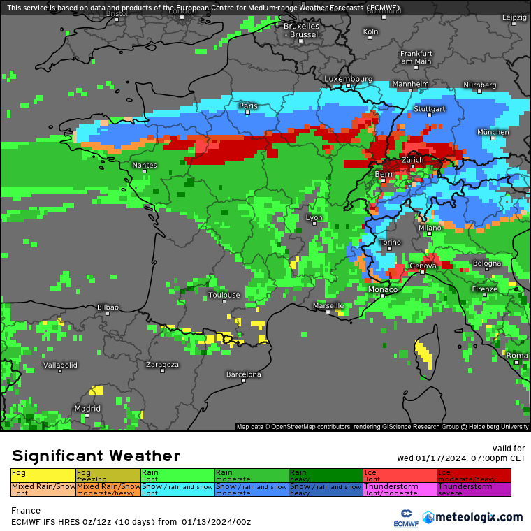 A ce jour, c’est le scénario qui ressort avec des modèles numériques qui ont été performants sur cette phase hivernale. D’autres modèles entrevoient une limite plus au nord notamment au nord de la Seine, tandis que d’autres voient une limite plus au sud sur les régions centrales avec des pluies verglaçantes.