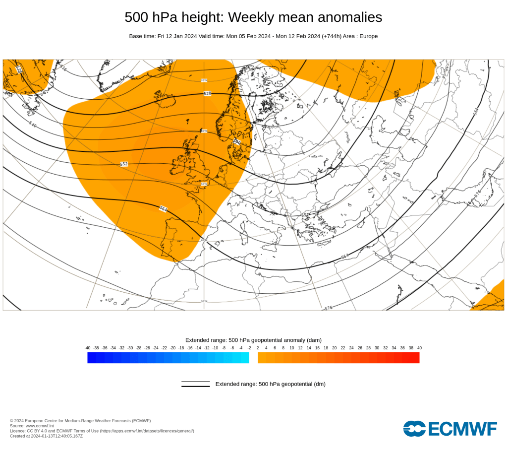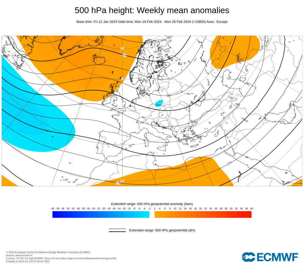 La prévision sub-saisonnière du centre européen pour l’emplacement des géopotentiels, corrobore complètement d’ailleurs la modélisation du C3S pour février. Récurrence des hauts géopotentiels, hautes pressions au hautes latitudes en Groenland et Islande, pouvant s’étirer possiblement vers la Scandinavie. Cela peut soumettre notre pays à des flux nordiques ou continentaux mais également à un courant perturbé océanique bas en latitude.