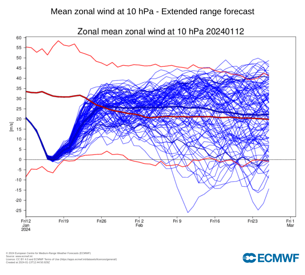 D’une manière plus technique, le phénomène El Nino commençant à décliner associé à des forçages tropicaux qui vont prendre en vigueur, ainsi qu’à une oscillation quasi biennale (QBO) orienté est, ainsi qu’un vortex polaire faible à tous les étages, favorisent la récurrence des blocages anticycloniques aux hautes latitudes favorables à des invasions froides aux latitudes moyennes de l’hémisphère nord. Cette phase de transition entre El Nino et une phase neutre avec des forçages plus marqués, vont possiblement permettre d’avoir une prévisibilité à moyen/long terme améliorée à l’échelle de l’hémisphère.