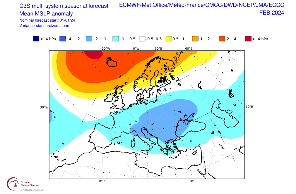 Le modèle numérique saisonnier C3S regroupant les modèles européen, anglais, de Météo France, canadien, américain, japonais, allemand notamment entrevoit un mois de février 2024 légèrement plus doux que la normale et plutôt humide. On note que la signature atmosphérique est celle marquée d’une NAO- (oscillation atlantique négative) propice à quelques descentes froides et à une circulation perturbée basse en latitude. On pourrait donc s’attendre à des alternances entre temps doux sans excès et humide et temps plus froid, avec un froid restant à l’affut sur le nord et nord-est de l’Europe. D’ailleurs encore un mois possiblement déficitaire en Scandinavie et ce depuis octobre 2023.