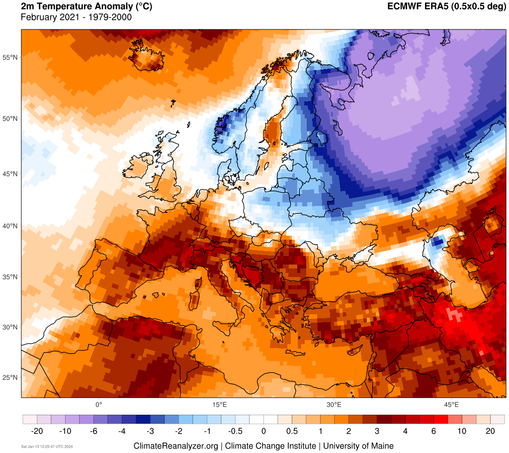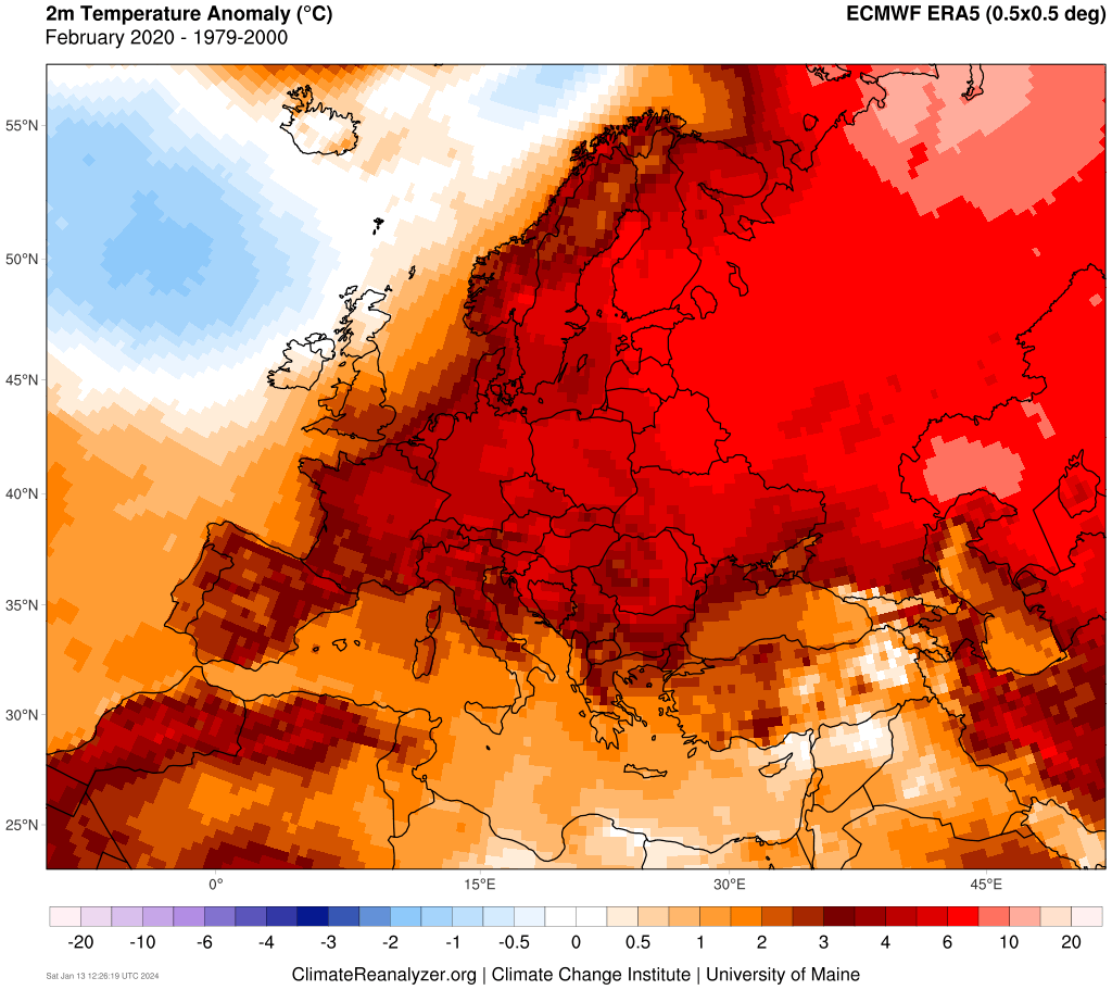 Ces réanalyses représente les anomalies de température pour les mois de février. Le rouge vif était souvent prédominant y compris pour le reste de l’Europe.