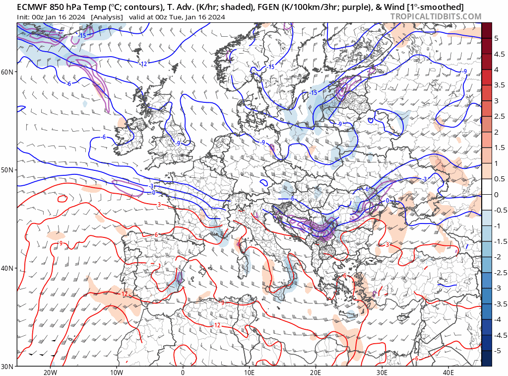 Deux masses d’air antagonistes vont s’affronter sur la France, l’une d’origine subtropicale chargée d’humidité et de douceur et l’autre d’origine polaire froide et plus sèche. Les isolignes rouges reflètent la douceur tandis que les isolignes bleus reflètent le froid. Les contours violets vont représenter là où le contraste thermique est le plus fort ce qui va favoriser les précipitations qu’elles soient pluvieuses, pluvio-neigeuses, verglaçantes et neigeuses.