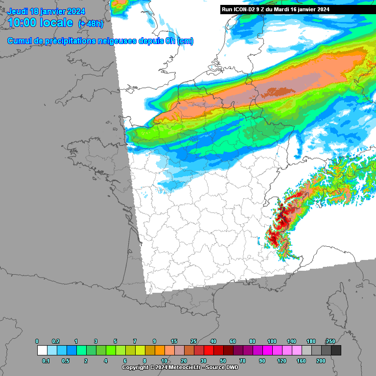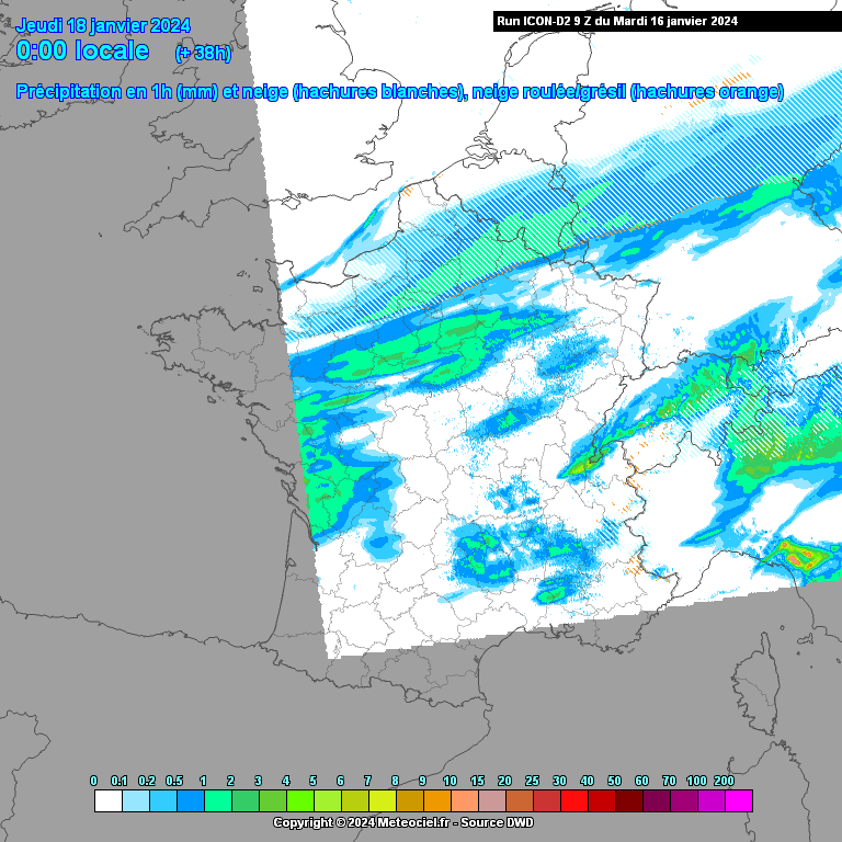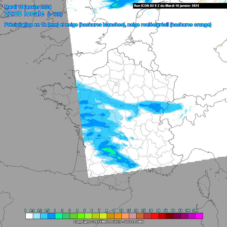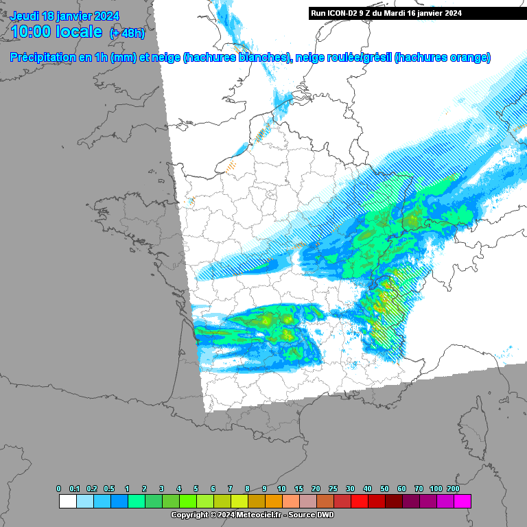 En cours de nuit prochaine et demain matin sous l’effet du redoux se diffusant en surface, les pluies seules gagneraient vers le nord, tandis que la neige pourrait tomber en plaine de la Seine Maritime à la Somme, jusqu’aux Ardennes. Pluies verglaçantes tout de même fort probables entre Lorraine et Bas Rhin. Le risque de pluies verglaçantes diminuera notablement demain au fur et à mesure de la journée.