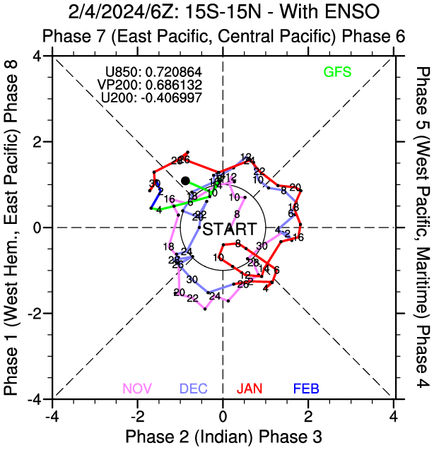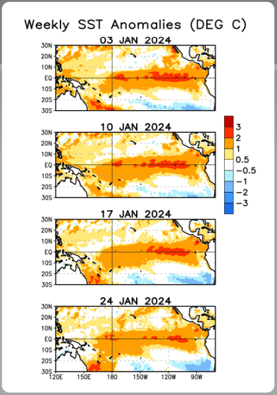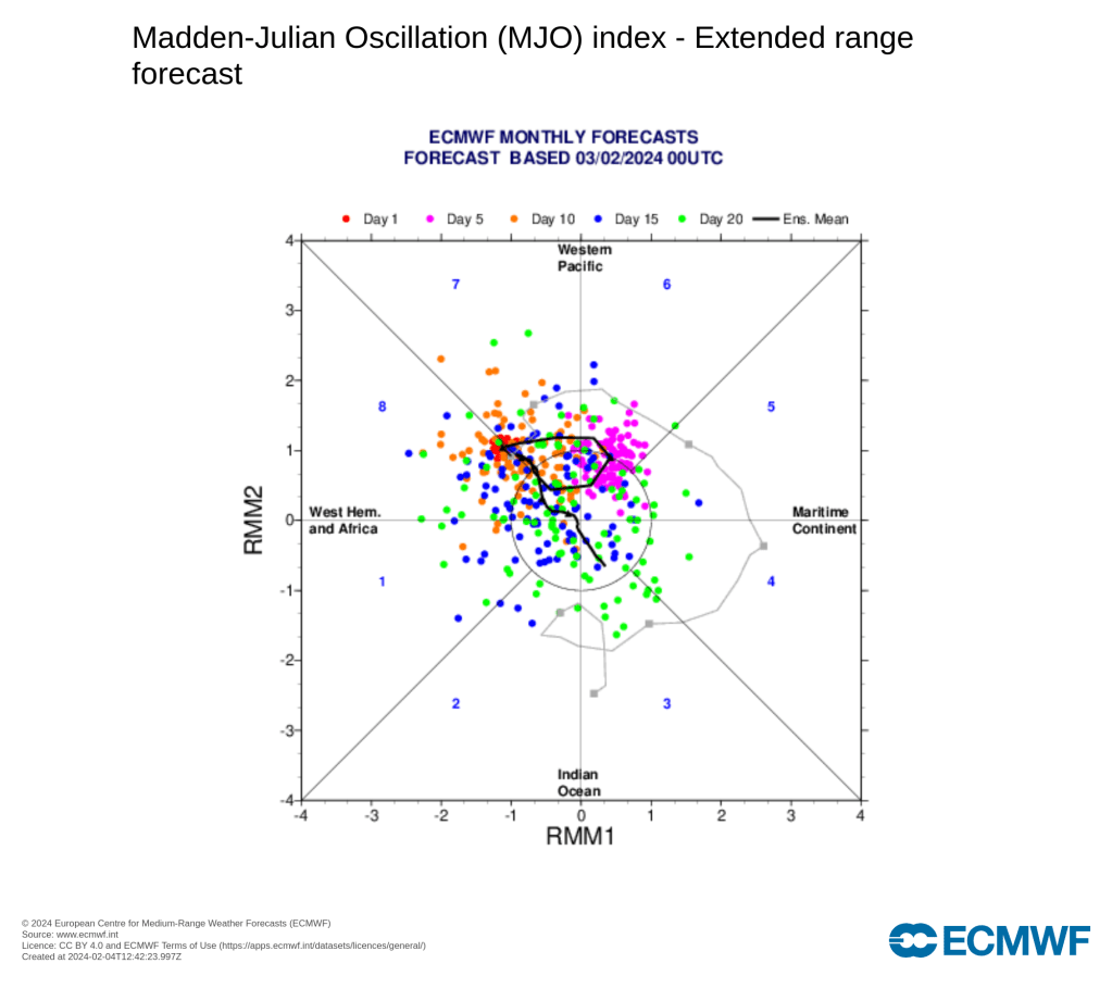 El Nino, donnera son dernier baroud d’honneur courant février avec une phase de vents d’ouest à venir sur le bassin provoquée par la MJO. Mars et avril sonneront la fin d’El Nino ensuite avec le retour à une phase neutre.