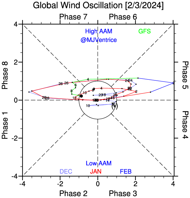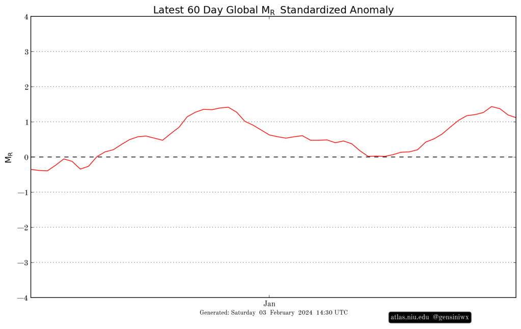 La MJO aura été active une bonne partie du mois de janvier avec un transfert progressif de l’hémisphère occidental à l’hémisphère oriental, puis revenant toute fin de mois sur l’hémisphère occidental. Alliée à des phases actives d’EAMT (AAM), cela renforce la prévisibilité à l’échelle hémisphérique. La MJO sur l’hémisphère occidental fin décembre, a bien favorisé par la suite des blocages de haute latitude entre la première décade de janvier et la fin de la deuxième décade. Une MJO inopérante quelques jours courant de mois puis ensuite en phases 3-4-5, a bien favorisé le retour d’un courant zonal à l’échelle de l’hémisphère corrélée à une EAMT+. On peut penser qu’une MJO dans l’hémisphère occidental toute fin de mois corrélée à une EAMT+, vont favoriser des blocages à haute latitude courant février.