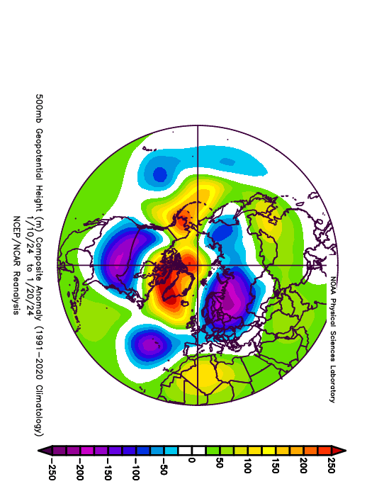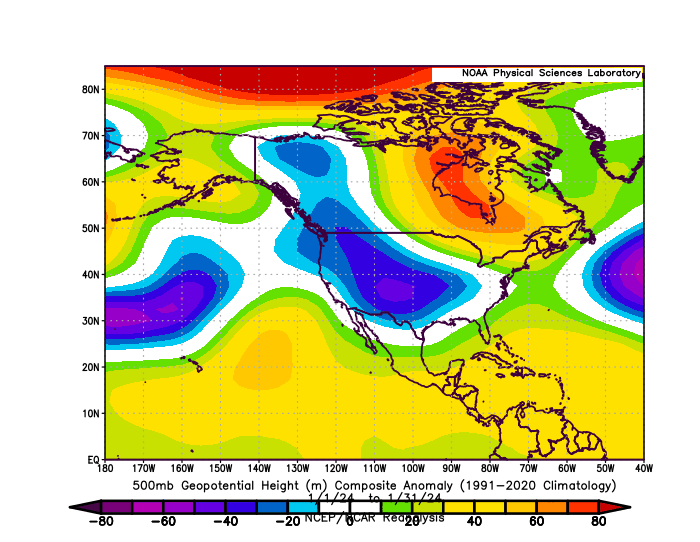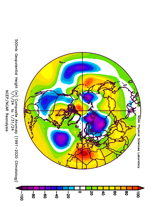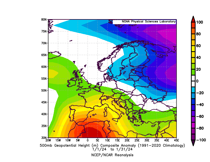 A l’échelle de l’hémisphère nord sur le mois entier de janvier 2024, on a le marqueur de l’empreinte atmosphérique El Nino sur le continent américain avec dipole bas géopotentiels en allant vers le sud-ouest des USA et hauts géopotentiels en allant vers le Canada. Europe plutôt sous flux océanique et influence sur la fin de mois des hauts géopotentiels subtropicaux. Bas géopotentiels récurrents entre Scandinavie et Russie.