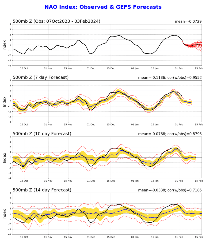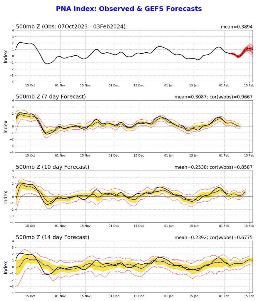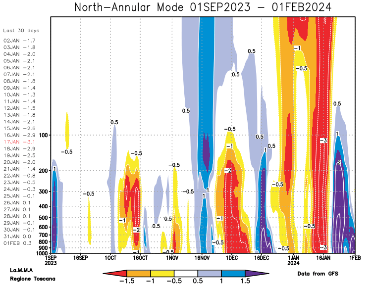 L’oscillation nord pacifique (PNA) aura un coup de mou mi-janvier passant en négatif reflétant bien l’invasion froide sur les USA provenant du Canada.