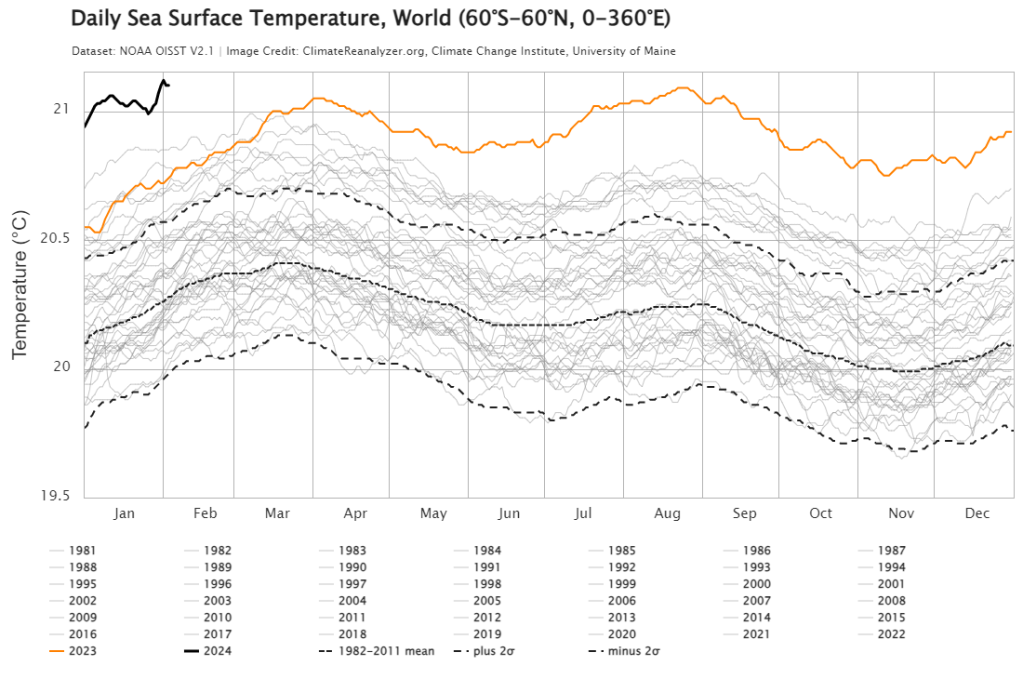 A l’échelle globale, janvier 2024 aura été le mois de janvier le plus chaud jamais enregistré dans l’ensemble des données JRA-55, à 1,56 °C au-dessus des niveaux préindustriels. Il a battu le record précédent de 2016 (lors du super El Nino cette année-là) d’environ 0,06 °C et est à +0,42 °C de janvier 2023. Source : Zeke Hausfather