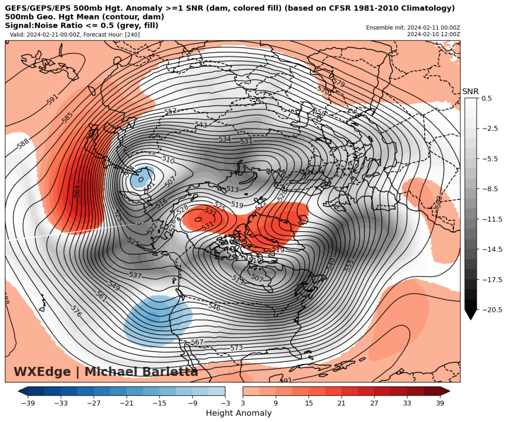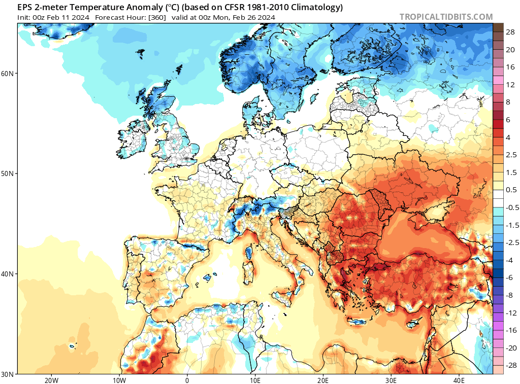Aussi loin qu’on regarde sur les modèles ensemblistes, rien ne montre qu’on pourrait avoir un coup de froid d’ici début mars. On pourrait tout au plus et encore l’échéance est fort lointaine, se rapprocher un peu plus des normales vers la fin du mois. Mais cette tendance est très très fragile et il est pas impossible que la douceur parfois forte nous accompagne d’ici début mars.