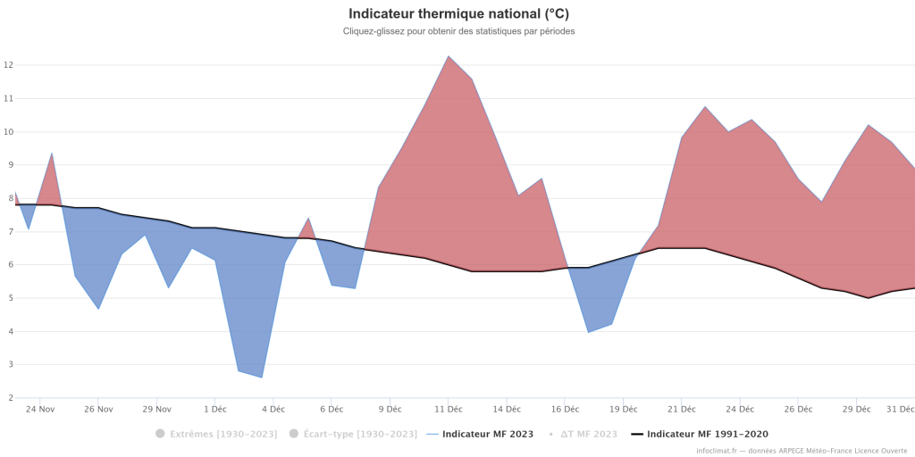 Depuis le 1er décembre début de l’hiver météorologique, les périodes froides qui se résument à un petit coup de froid début décembre (même si concrètement cela avait un peu débuté fin novembre) et à une deuxième décade de janvier sous un froid parfois notable par endroit, ont été très largement compensées par des périodes excessivement douces notamment autour des fêtes et sur fin janvier-début février.