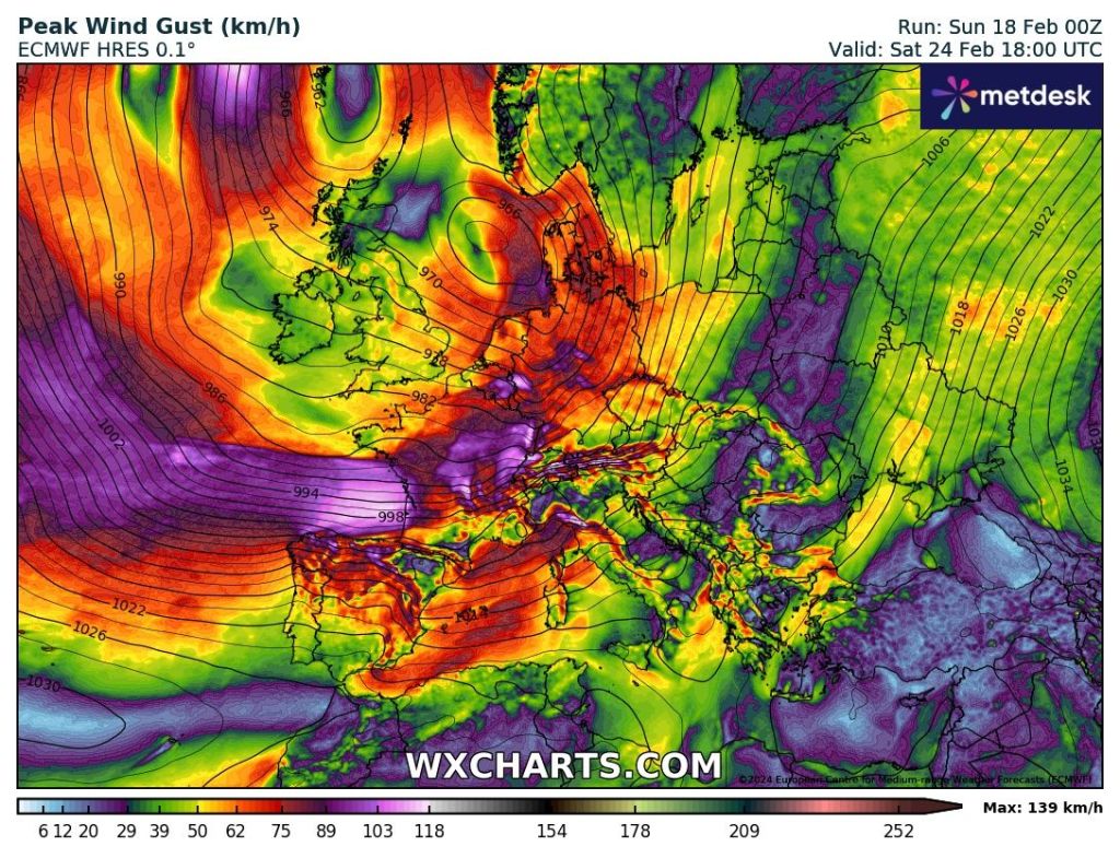 Pour la semaine suivante du 26 février, le scénario majoritaire est la poursuite de conditions perturbées dans un flux de nord-ouest ramenant de nombreuses perturbations donnant pluie, vent et neige en montage à relativement basse altitude.