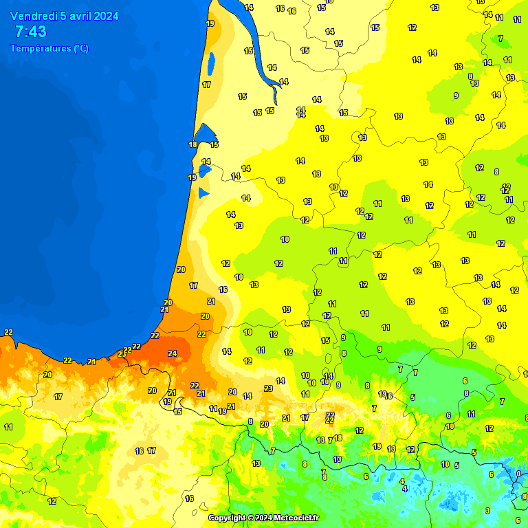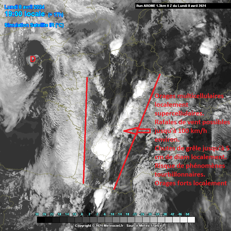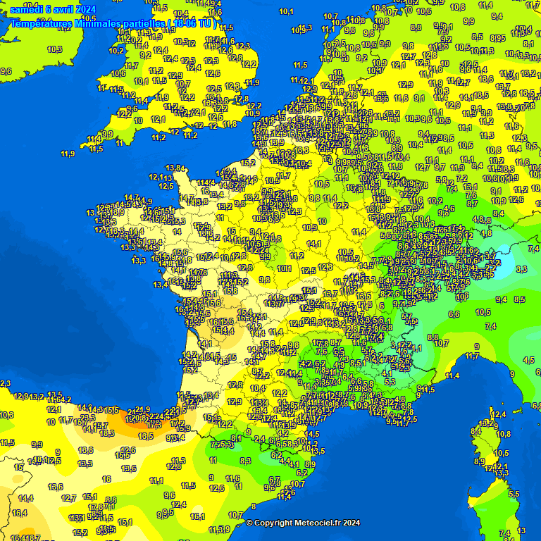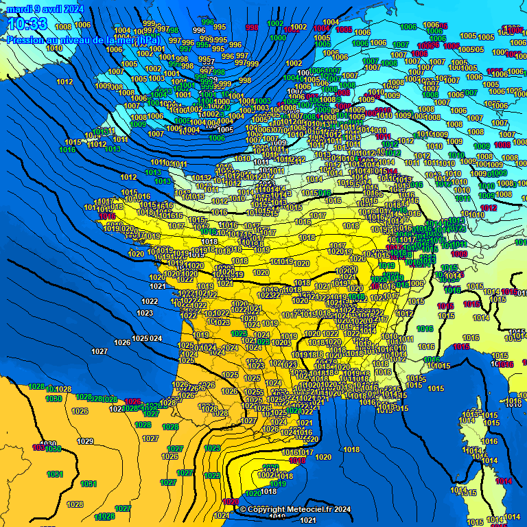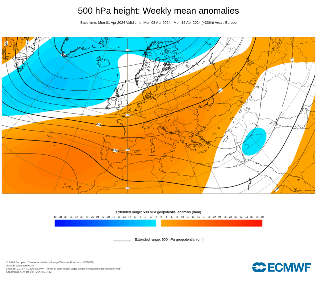 Jusqu’au dimanche 14 avril, alternance de temps. Dégradation pluvio-orageuse et refroidissement entre lundi 8 et mardi 9. Les conditions anticycloniques se rétablissent ensuite pour le restant de la semaine et week-end suivant compris avec des températures progressant (on pourrait de nouveau atteindre les 25-30°C entre le vendredi et le dimanche).