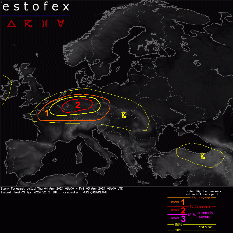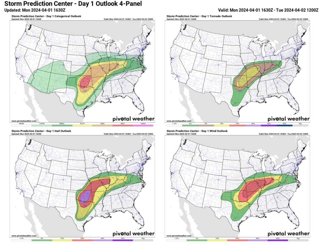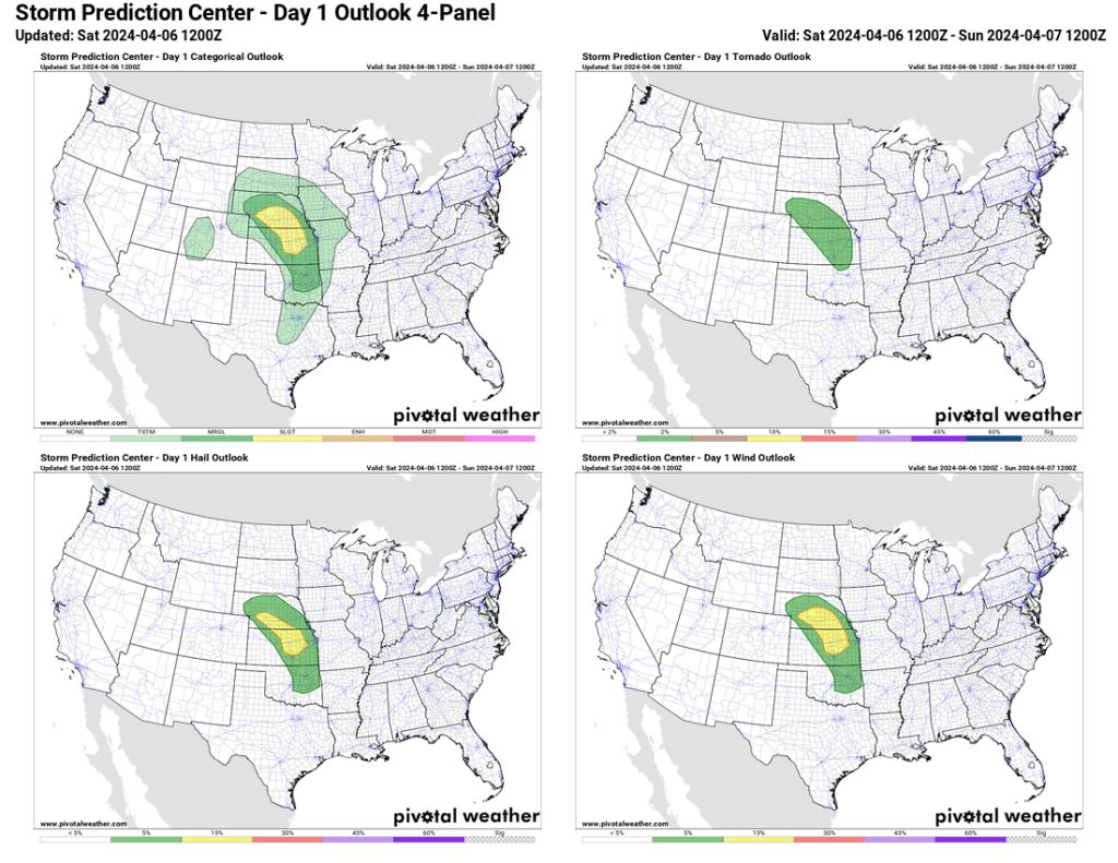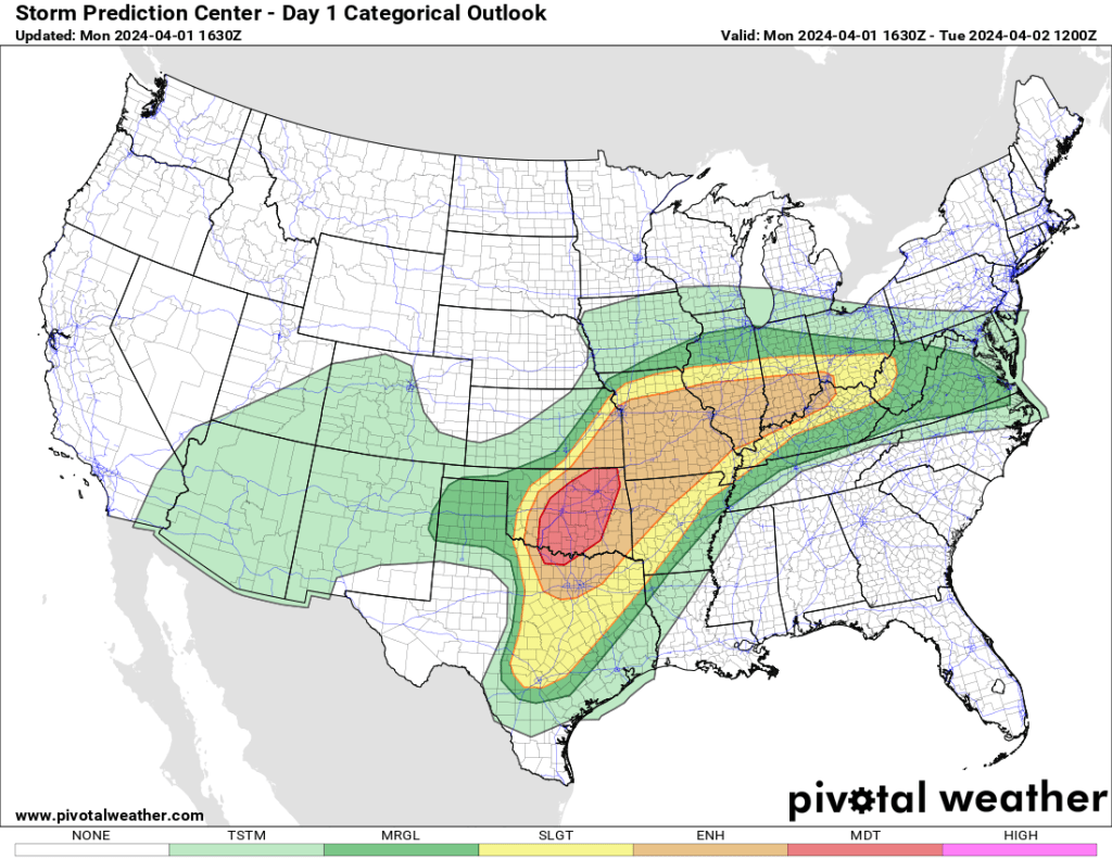 Des orages violents sont prévus d’ici quelques heures entre l’Oklahoma et le Missouri notamment. Le risque tornadique est important et évalué à 10% par le SPC. De plus, il est attendu des tornades nocturnes ce qui accentue la dangerosité possible de cet épisode. Le risque de grosse grêle est très important sur l’Oklahoma