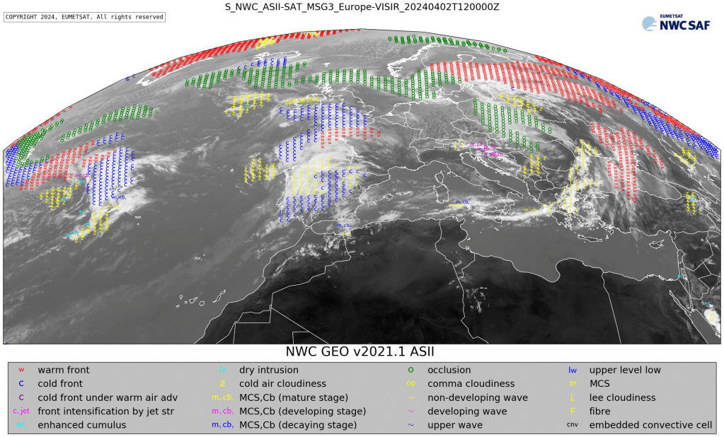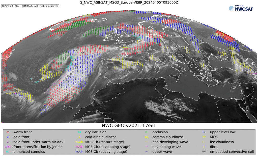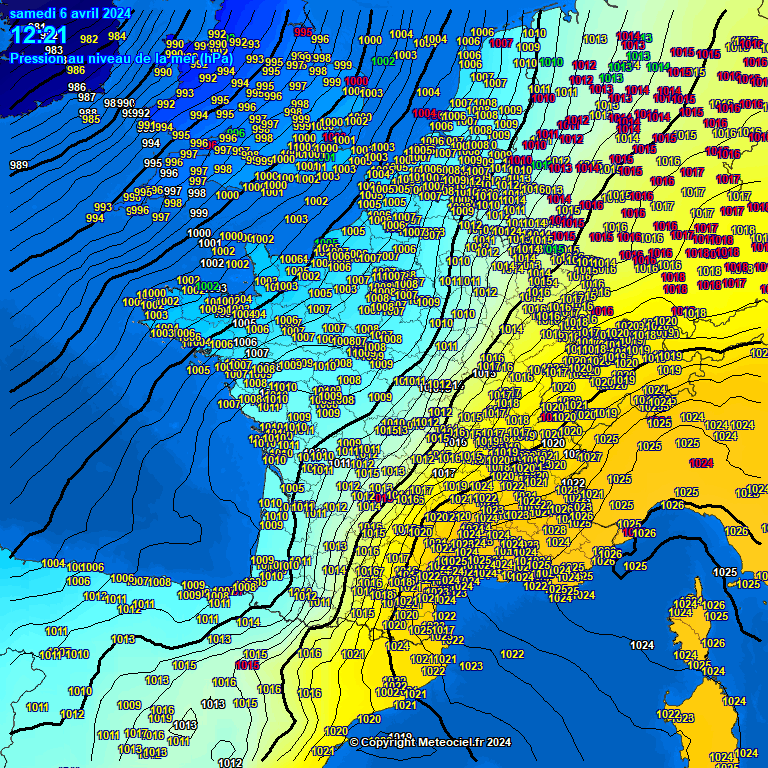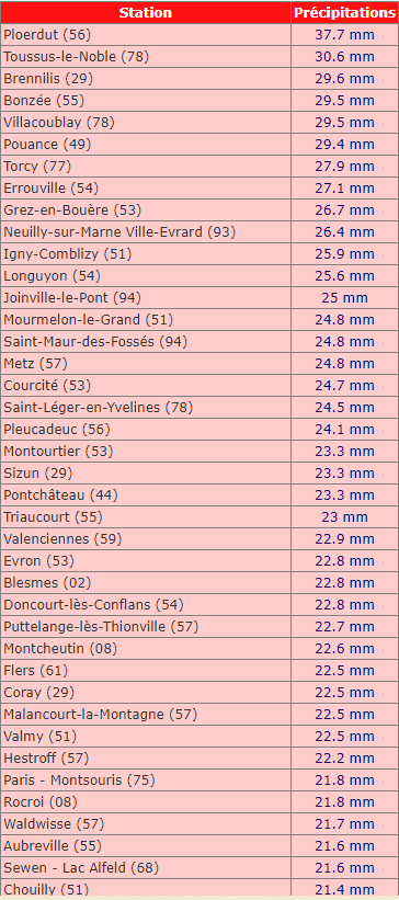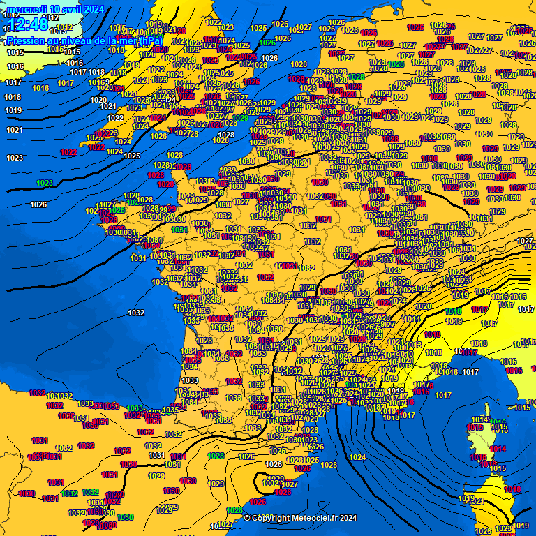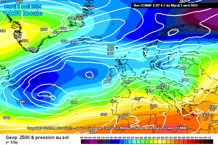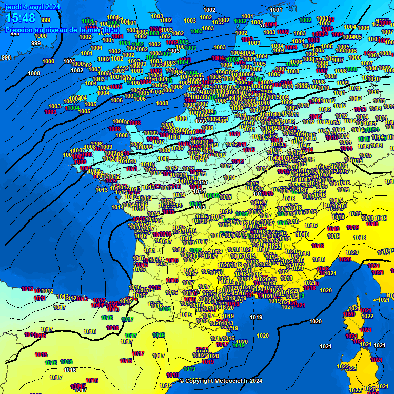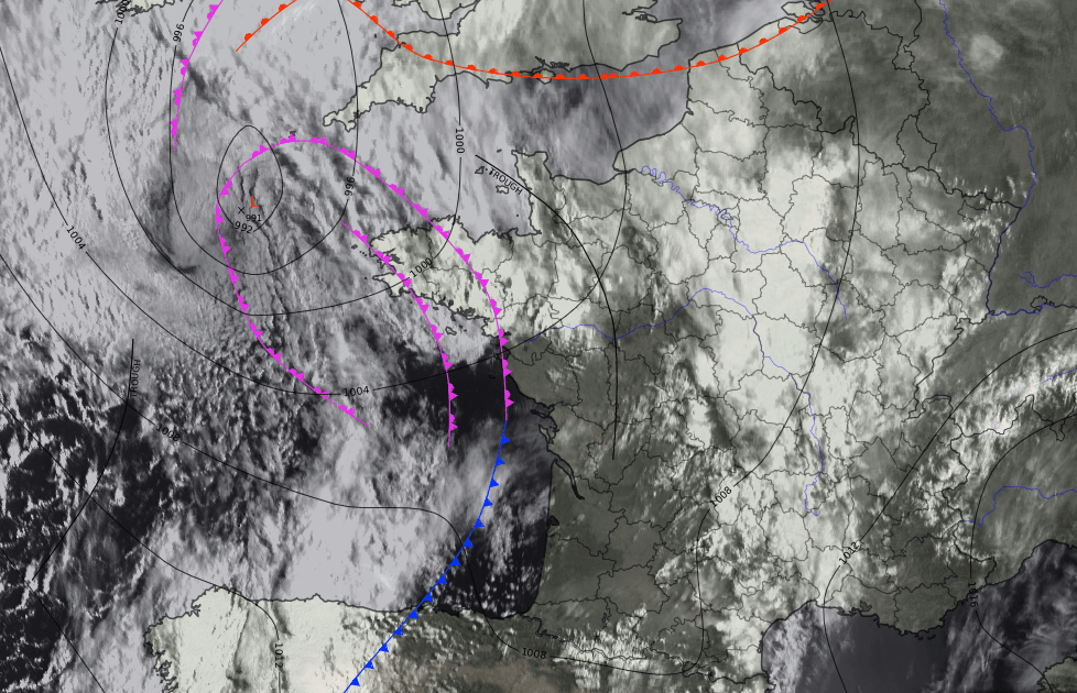. Les géopotentiels remontent ainsi que les pressions avec une accalmie assez générale qui se met en place. Une perturbation arrive cependant par le nord-ouest en donnant des pluies (tout d’abord le front chaud suivi du front froid). Quelques averses retardataires circulent sur le nord-est. Ailleurs temps assez ensoleillé malgré le passage de cumulus.