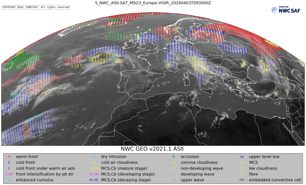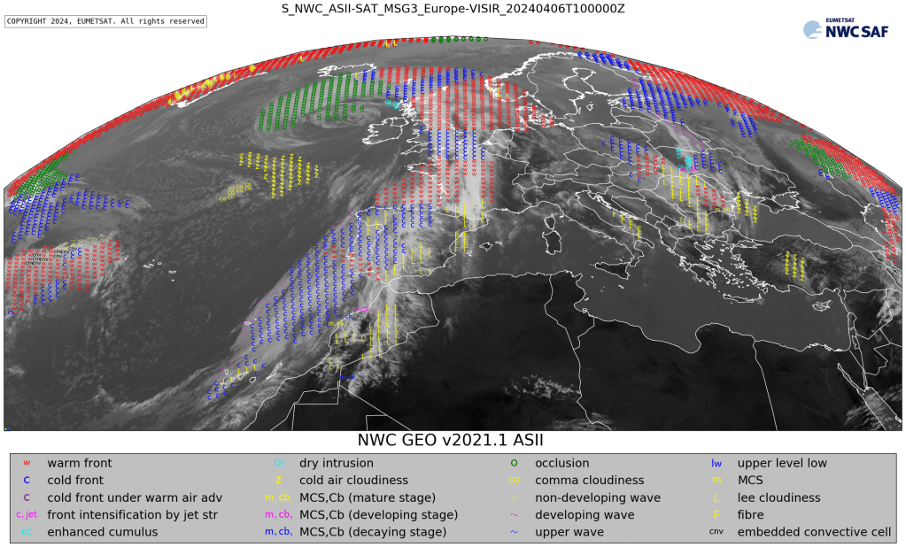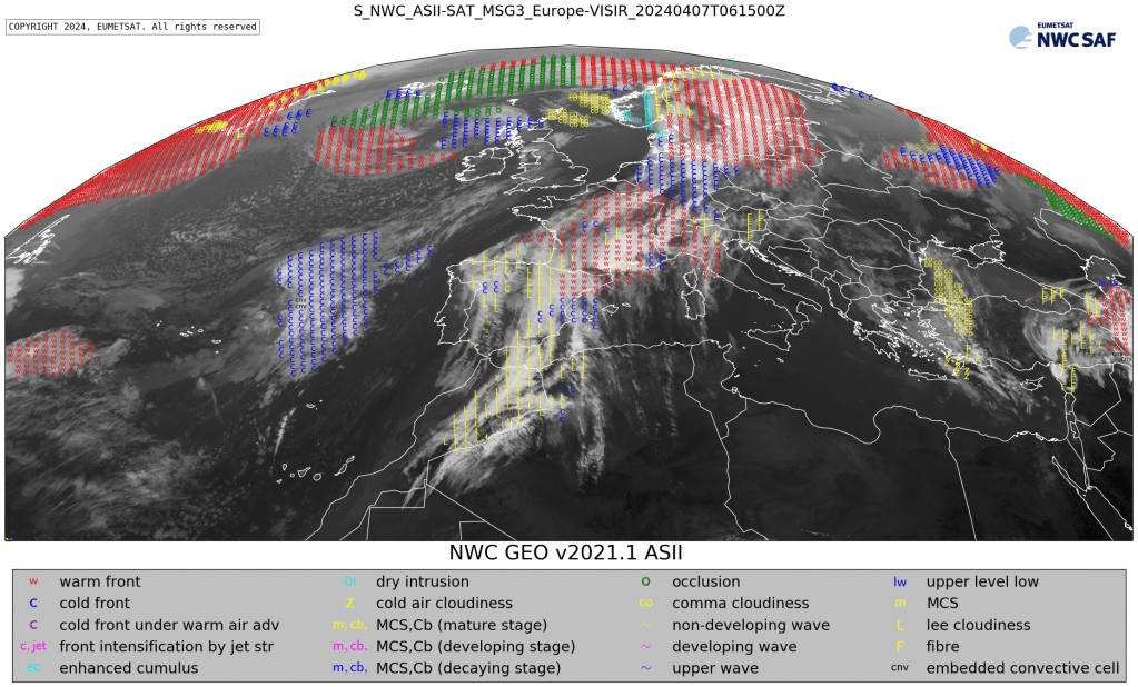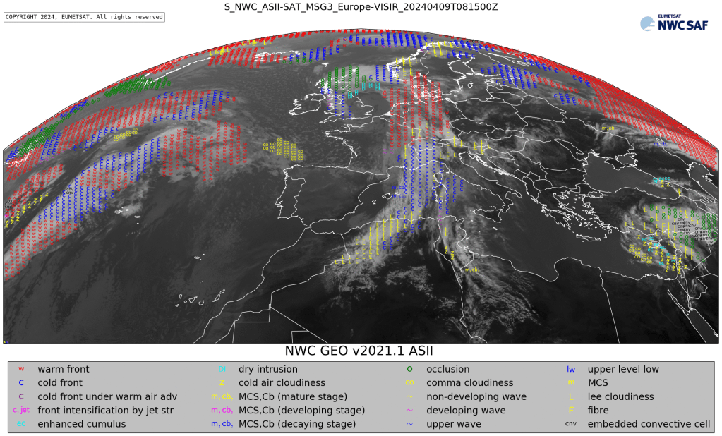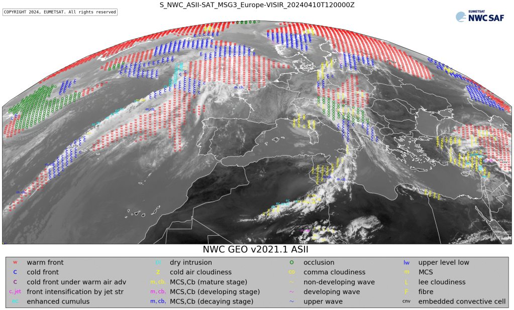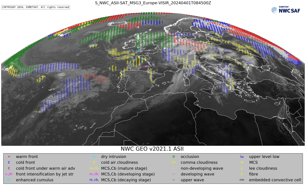 . Les géopotentiels remontent ainsi que les pressions avec une accalmie assez générale qui se met en place. Une perturbation arrive cependant par le nord-ouest en donnant des pluies (tout d’abord le front chaud suivi du front froid). Quelques averses retardataires circulent sur le nord-est. Ailleurs temps assez ensoleillé malgré le passage de cumulus.