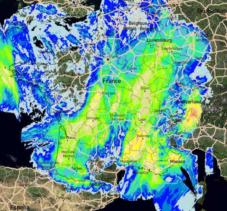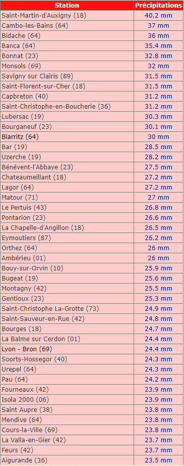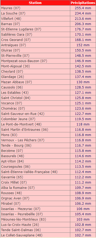 Nombreux cumuls de pluie de plus de 100 mm depuis 72 h avec des lames d’eau très importantes en Ardèche/Lozère de plus de 200 mm.