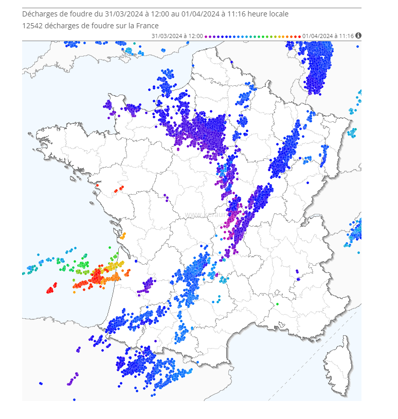 Bonne activité orageuse encore une fois depuis 24 h avec 12 542 éclairs. Lignes orageuses multicellulaires et quelques supercellules sont à relever.