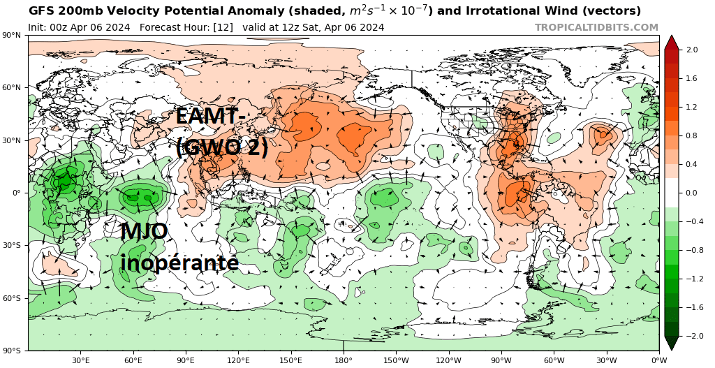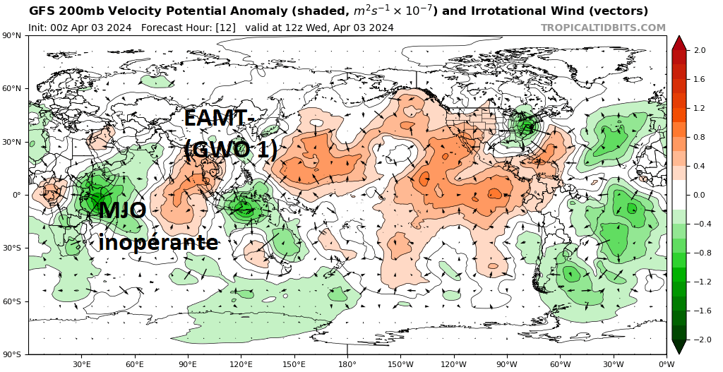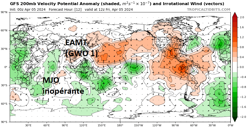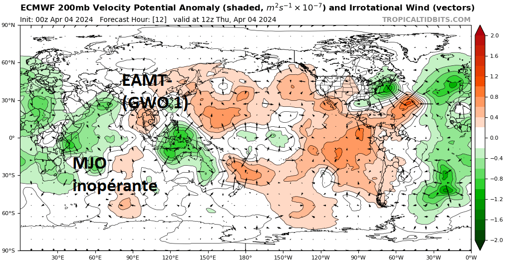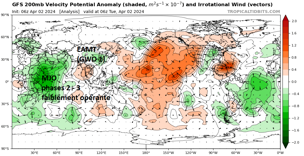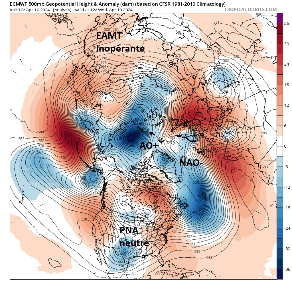 La MJO phases 3-4 ont favorisé un temps perturbé, la MJO phase 5 précédente a favorisé comme attendu un temps plus anticyclonique sur l’Europe de l’ouest et des perturbations rejetées plus au nord, ce temps plus anticyclonique a été opérationnel la semaine du 18 mars. L’AAM+ corrélé à une MJO phase 6-7-8 écoulé, sont favorables à une oscillation nord atlantique temporairement négative et un flux océanique. La NAO+ pourrait ensuite se réinstaller petit à petit sur avril en liaison avec des forçages tropicaux moins opérants, ce qui pourrait favoriser à terme le retour de conditions plus anticycloniques mais probablement pas avant le 15 avril. La deuxième quinzaine d’avril serait plus anticyclonique et bien douce.
