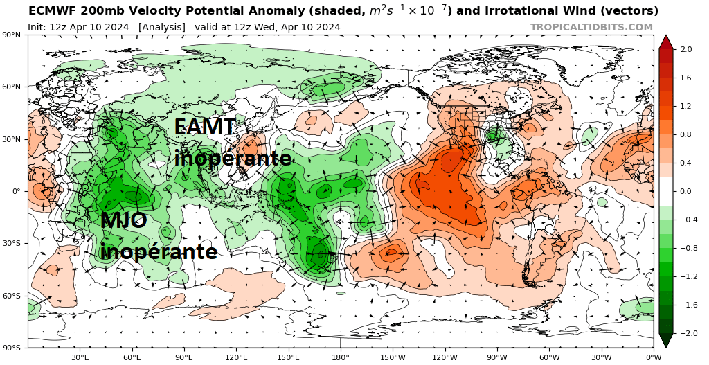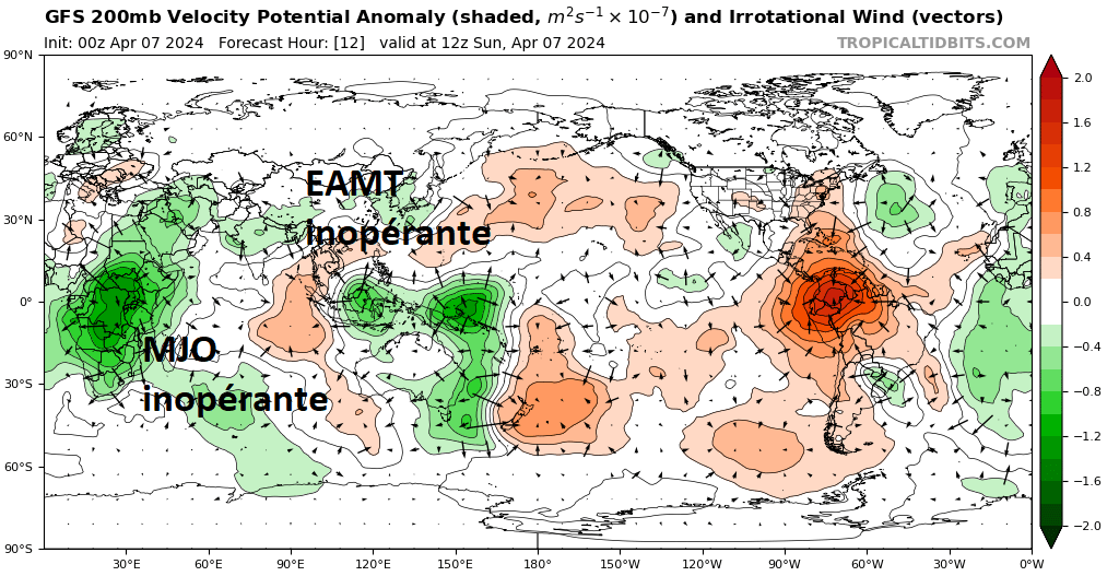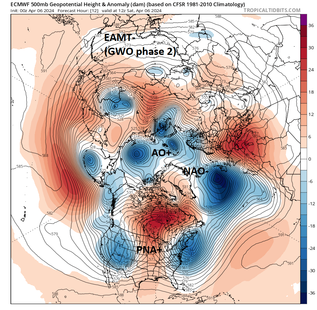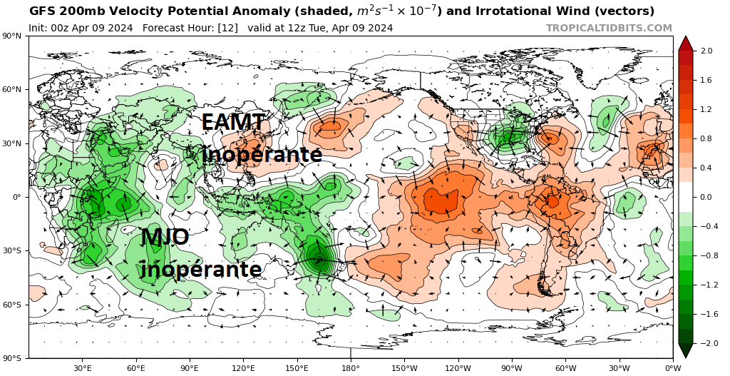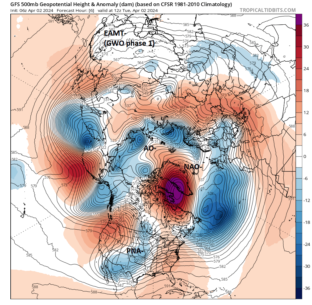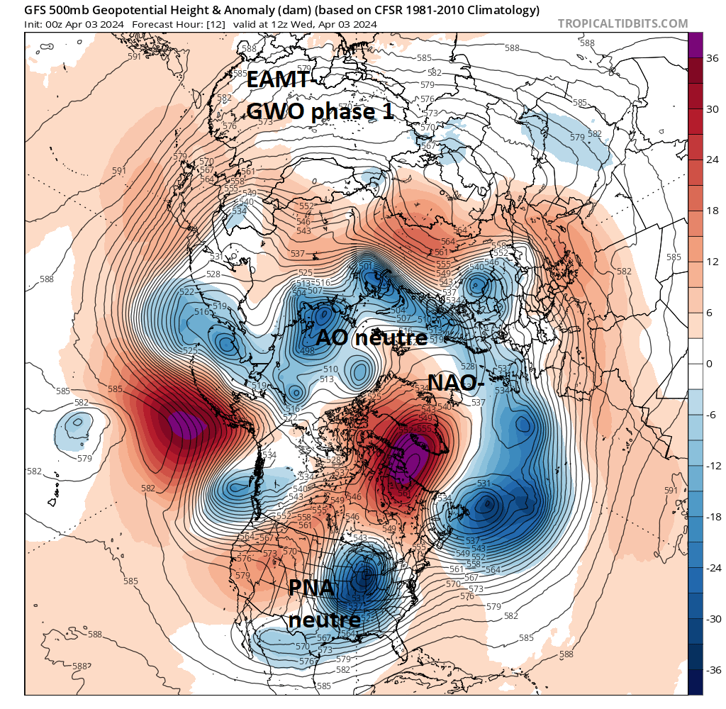 La MJO phases 3-4 ont favorisé un temps perturbé, la MJO phase 5 précédente a favorisé comme attendu un temps plus anticyclonique sur l’Europe de l’ouest et des perturbations rejetées plus au nord, ce temps plus anticyclonique a été opérationnel la semaine du 18 mars. L’AAM+ corrélé à une MJO phase 6-7-8 écoulé, sont favorables à une oscillation nord atlantique temporairement négative et un flux océanique. La NAO+ pourrait ensuite se réinstaller petit à petit sur avril en liaison avec des forçages tropicaux moins opérants, ce qui pourrait favoriser à terme le retour de conditions plus anticycloniques mais probablement pas avant le 15 avril. La deuxième quinzaine d’avril serait plus anticyclonique et bien douce.
