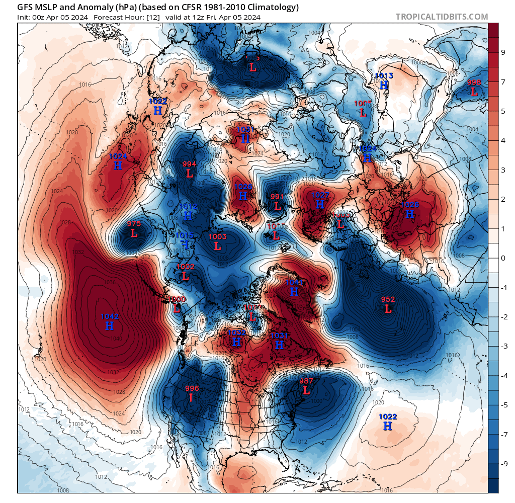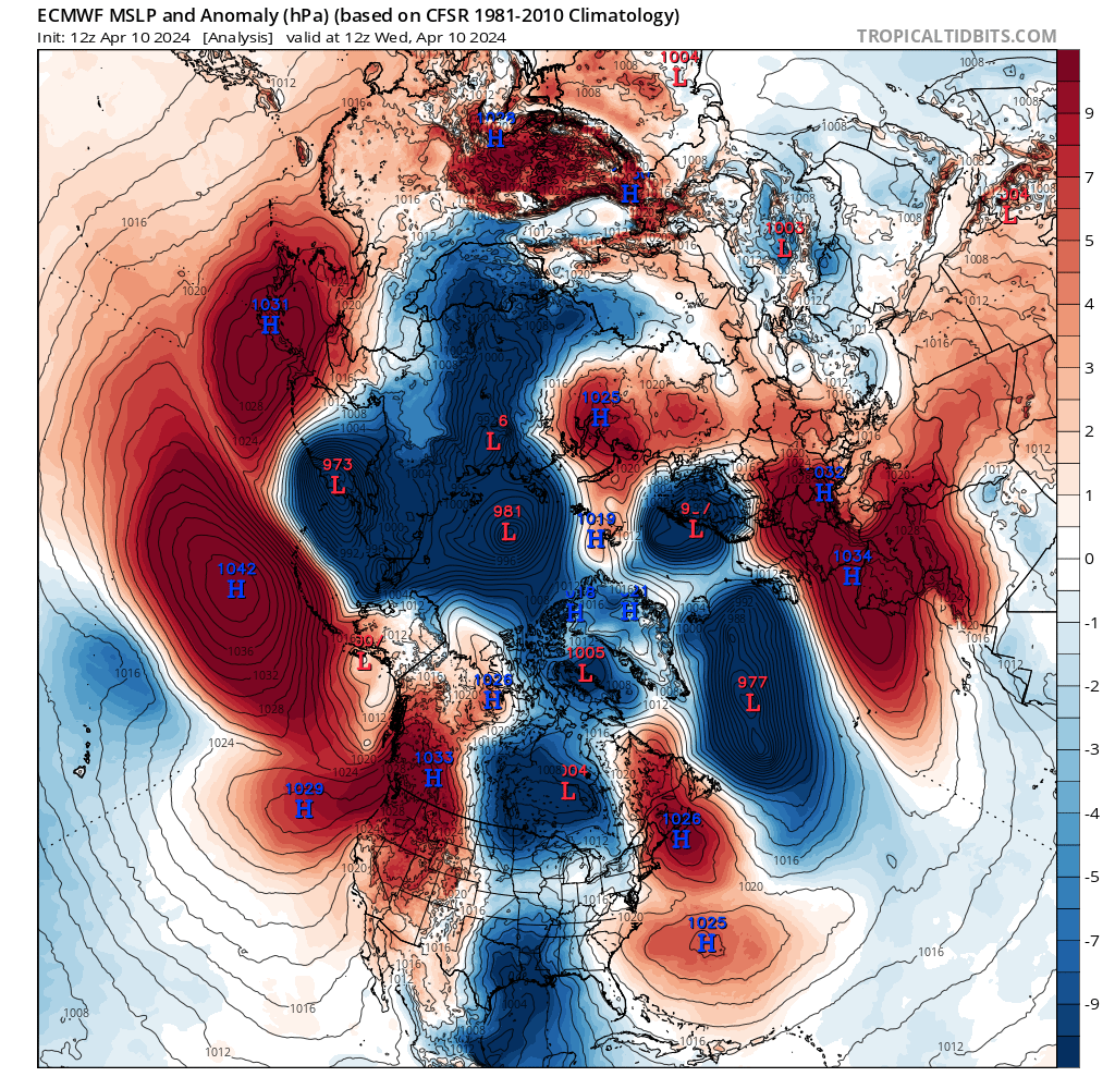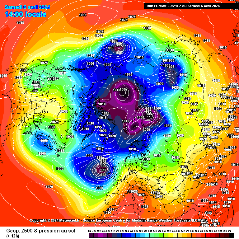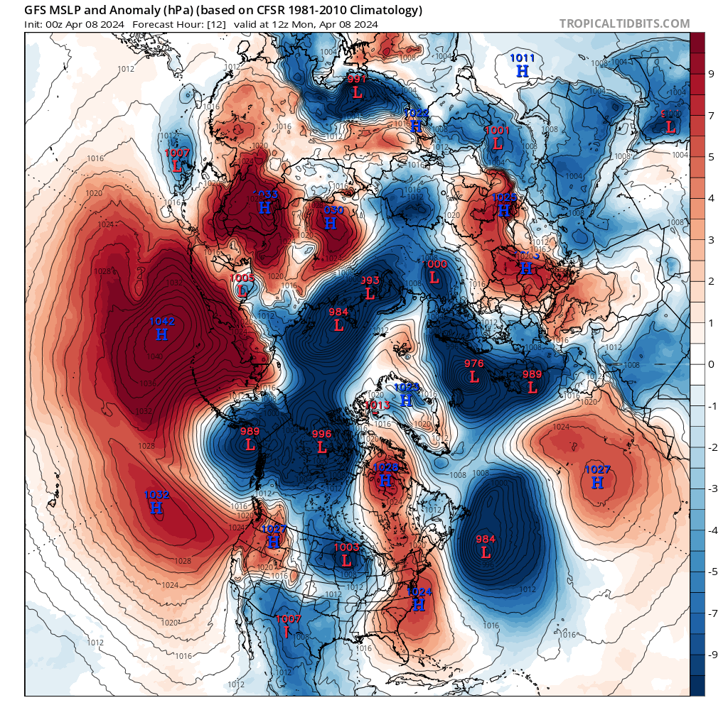 . Basses pressions nord et sud USA. Hautes pressions extrême est et ouest USA. Hautes pressions ouest et est Canada. Basses pressions nord et sud Canada. Basses pressions Alaska. Bas géopotentiels Alaska. Hauts géopotentiels Canada sauf centre-sud. Hauts géopotentiels est et ouest USA. Bas géopotentiels sud-ouest au Midwest des USA.