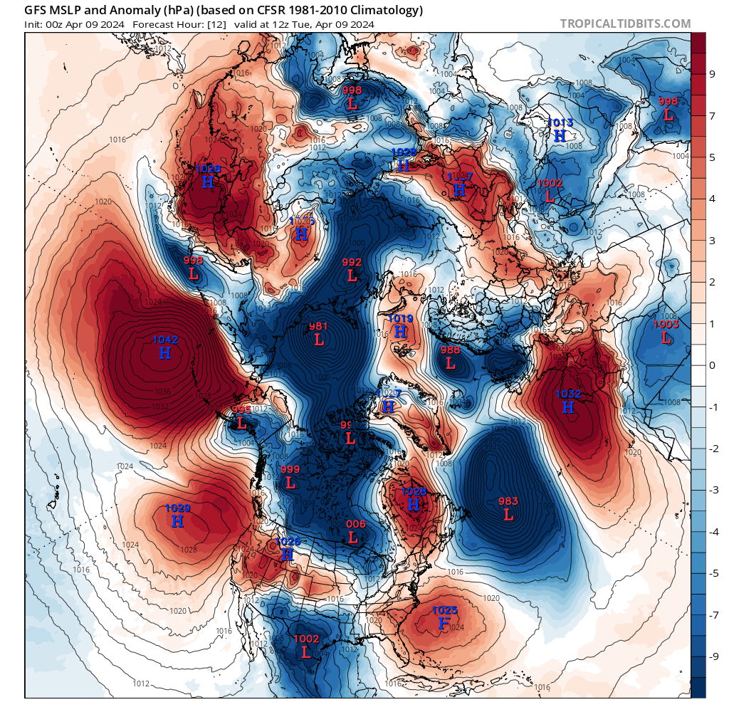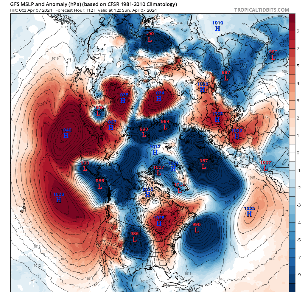 . Basses pressions nord, centre-est et sud USA. Hautes pressions est et ouest/centre-sud USA. Hautes pressions est Canada. Basses pressions reste du Canada. Basses pressions Alaska. Bas géopotentiels Alaska. Hauts géopotentiels Canada sauf ouest/extrême nord-est et extrême sud. Hauts géopotentiels est et ouest USA. Bas géopotentiels sud-ouest au Midwest des USA.