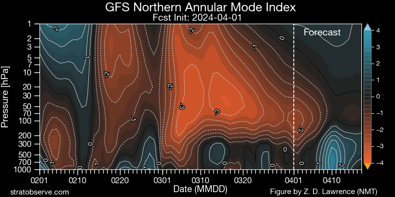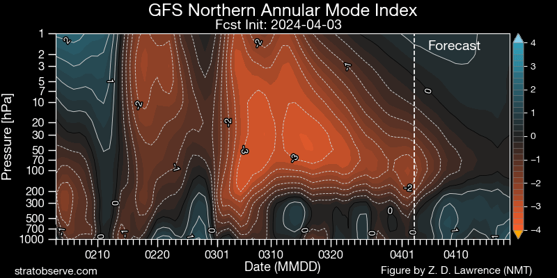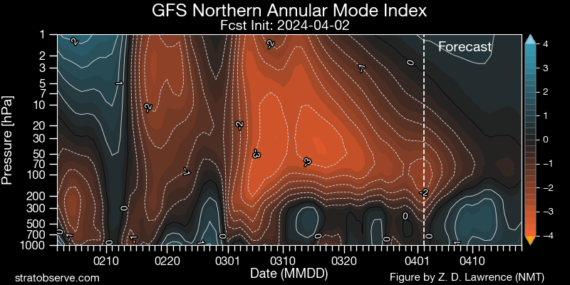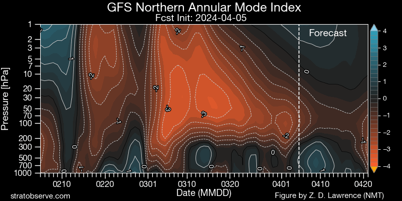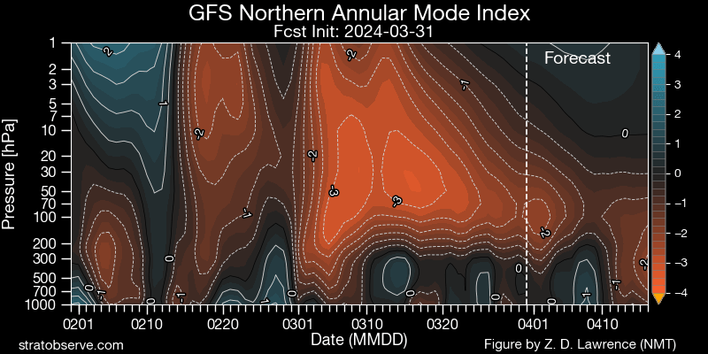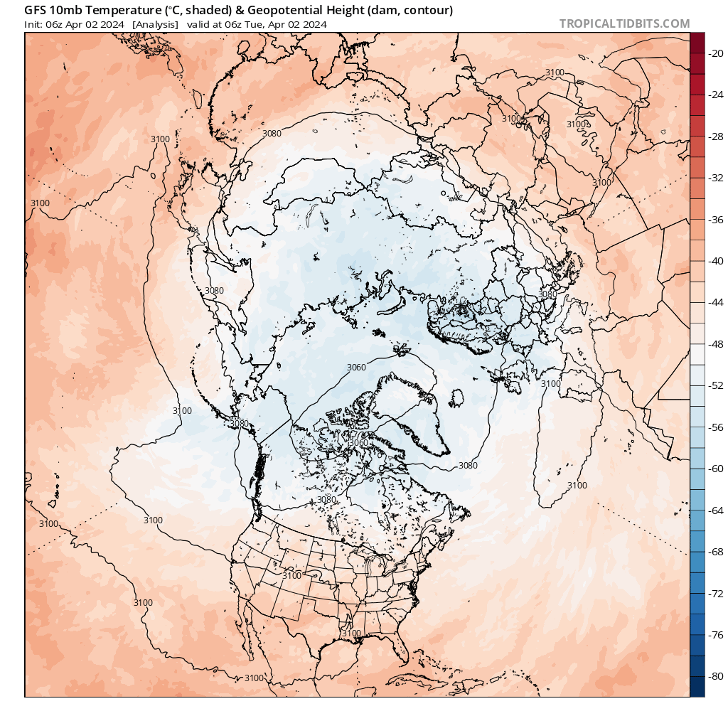Reprise des vents zonaux à 10 hPa effective le 26 mars, mais à une vitesse très limitée signe d’un vortex polaire faible. L’extinction complète du vortex polaire devrait intervenir toute fin avril – début mai.