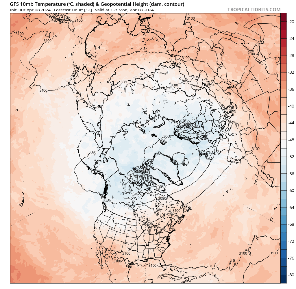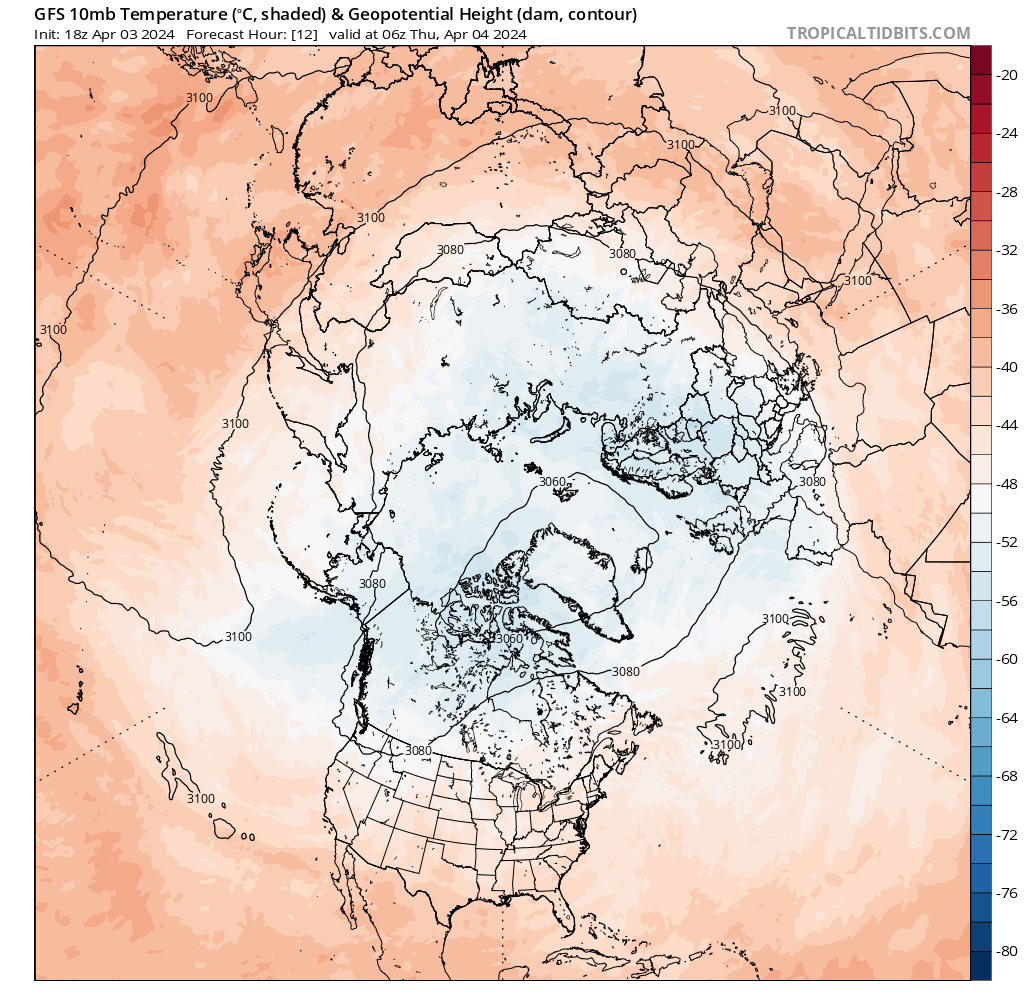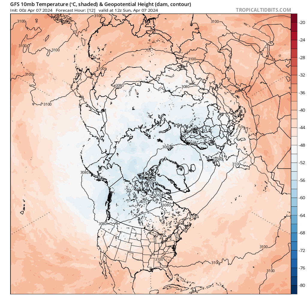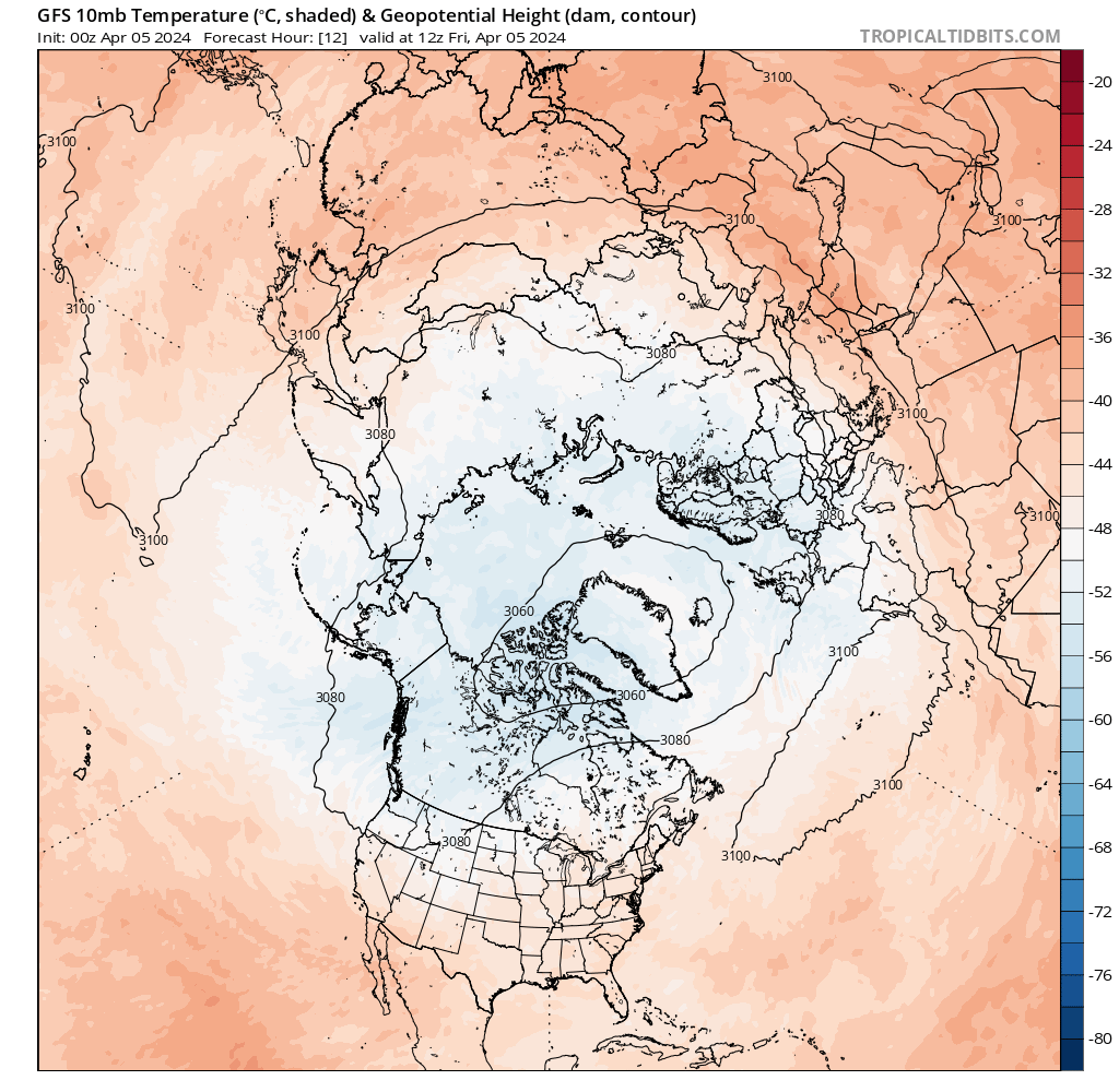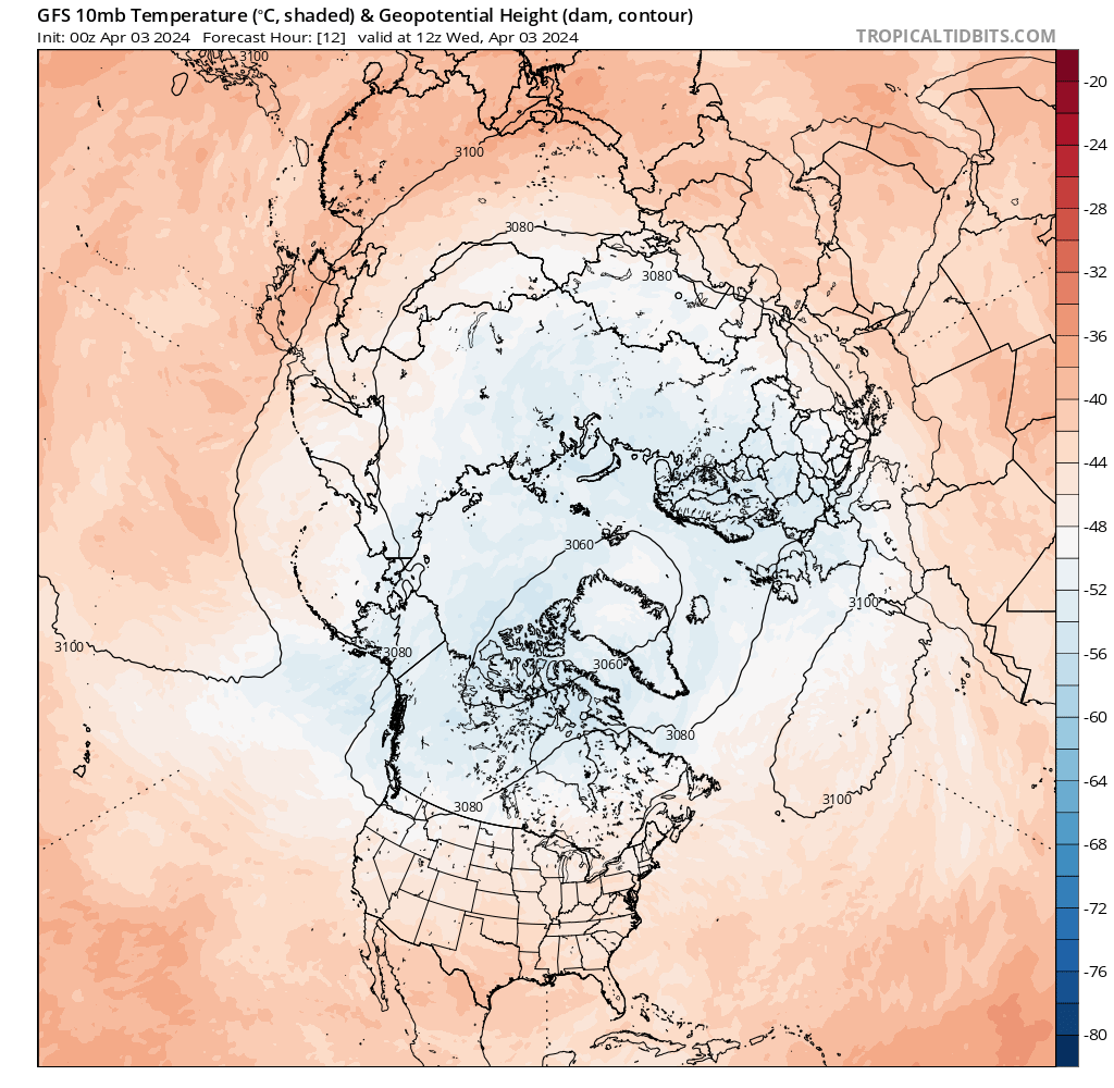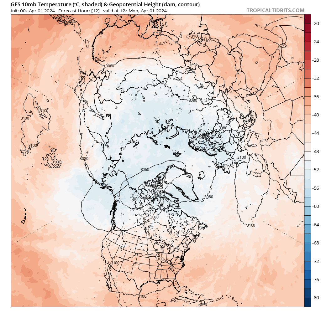 . Vortex polaire troposphérique rentrant dans une phase d’affaiblissement de nouveau, le gros du vortex bascule sur l’Eurasie. Nous entamons une période où le vortex va être malmené à tous les étages pour amener ensuite certainement à son extinction d’ici fin avril au plus tard.