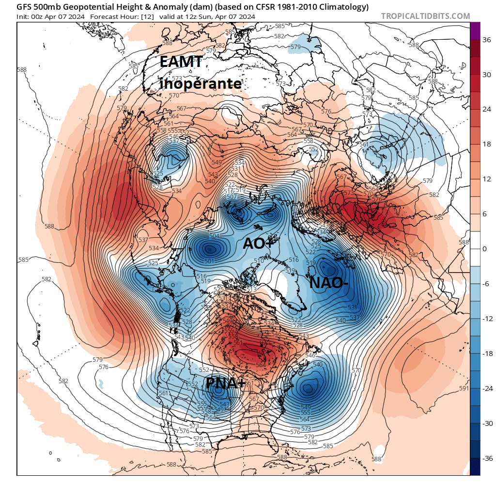. Basses pressions est USA. Hautes pressions ouest USA. Hautes pressions est Canada. Basses pressions ouest Canada sauf extrême sud/sud-ouest. Hautes pressions ouest Alaska/ Basses pressions est Alaska. Bas géopotentiels Alaska. Hauts géopotentiels Canada sauf extrême est/extrême sud et territoires du nord-ouest. Hauts géopotentiels ouest et est USA. Bas géopotentiels nord, centre et sud USA.
