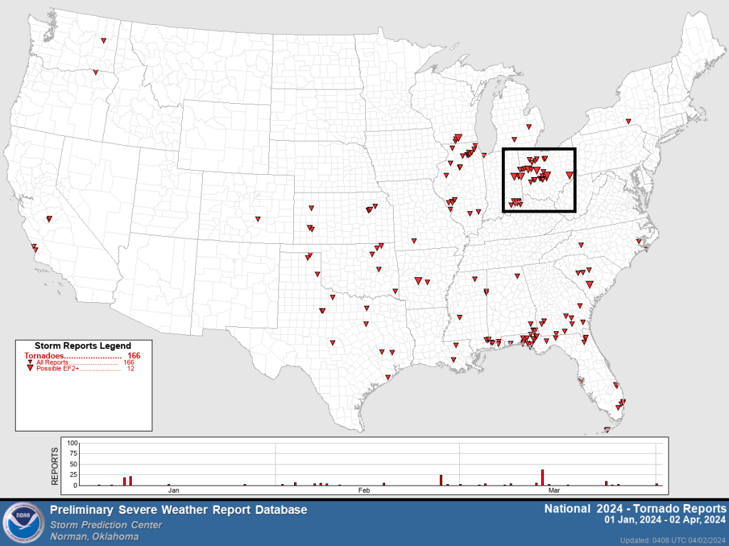 On note une forte anomalie tornadique depuis le début d’année dans le nord/nord-est des USA notamment pour l’Indiana et plus encore l’Ohio. Les anomalies douces/chaudes constamment présentes et l’absence d’hiver digne de ce nom, expliquent cela.
