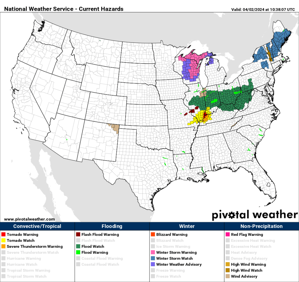 Conditions hivernales près des Grands lacs et extrême nord-est des USA. Alerte aux orages violents, tornades et inondations entre Missouri, Kentucky, Illinois, Indiana, Ohio, Virginie Occidentale et Pennsylvanie