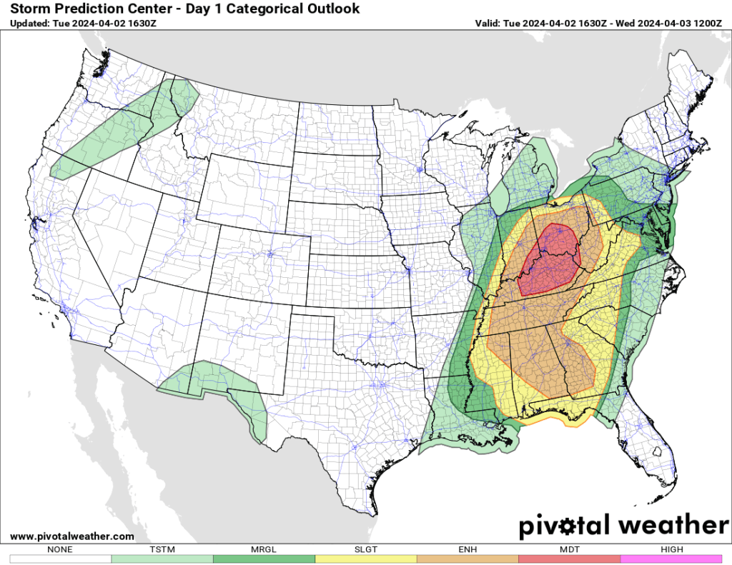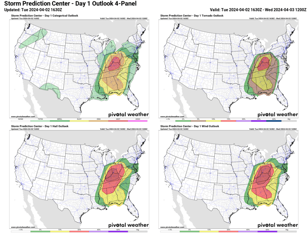 Risque d’orages violents très étendu aux USA aujourd’hui. Les plus sévères avec un risque de tornades puissantes EF2 et + concernent le Kentucky et l’Ohio. Les autres risques dont la grosse grêle et les rafales de vent descendantes destructrices sont à prendre en compte.