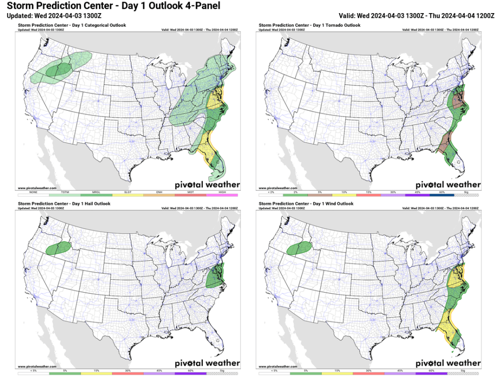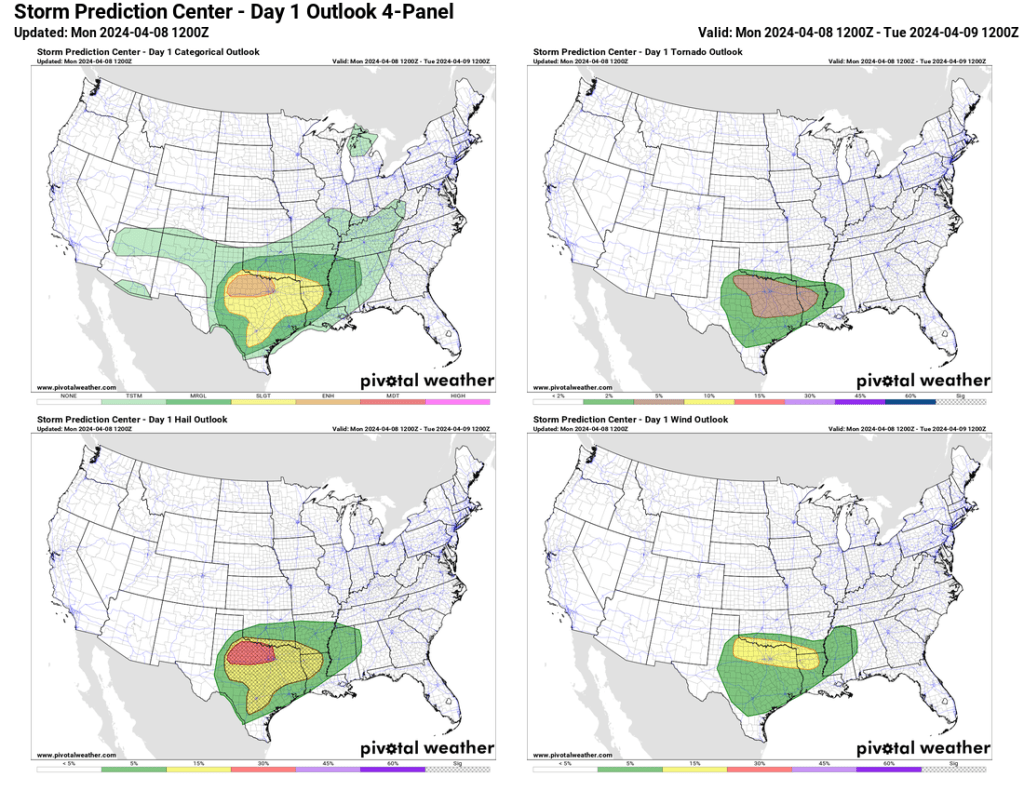 Risque d’orages violents d’ici quelques heures entre Texas et Louisiane. Risque gréligène important ainsi que de tornades. Le risque tornadique est évalué à 10% par le SPC.