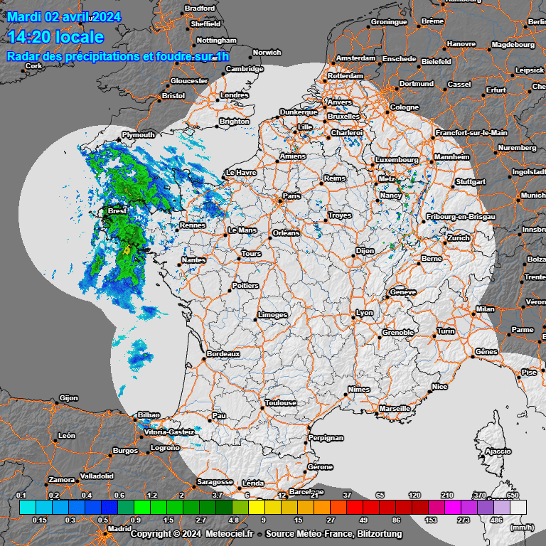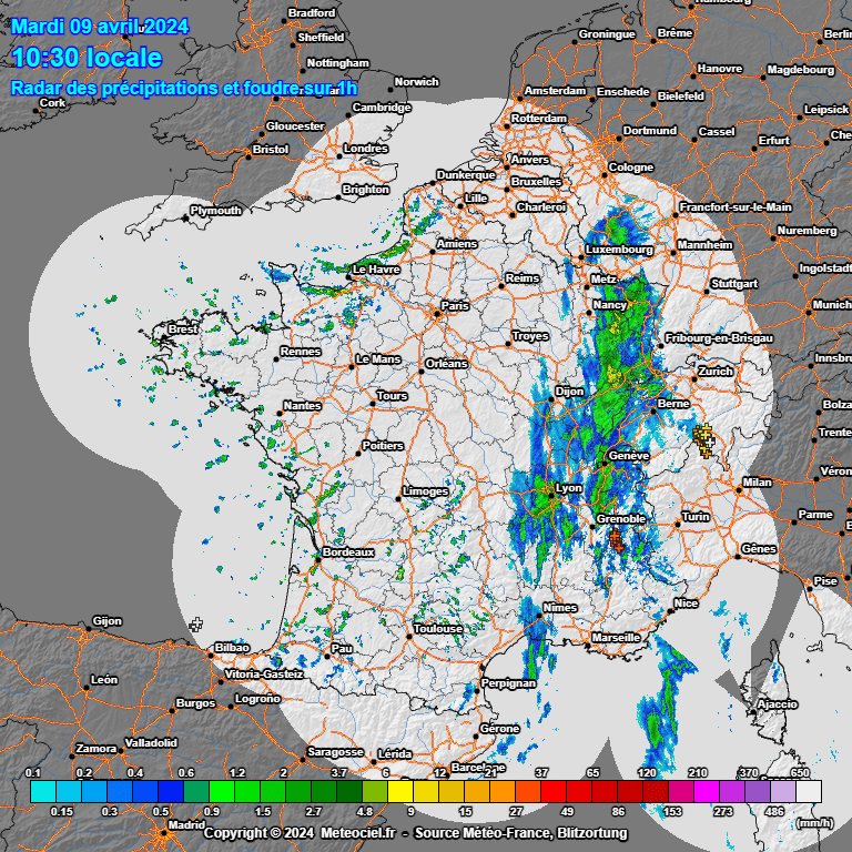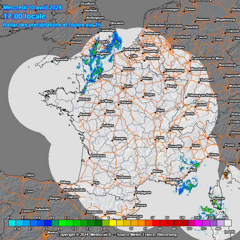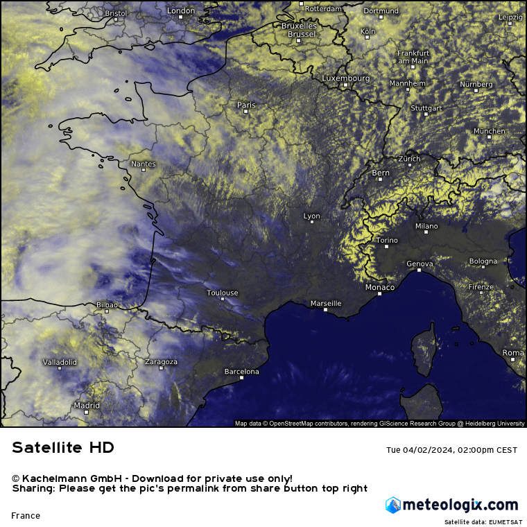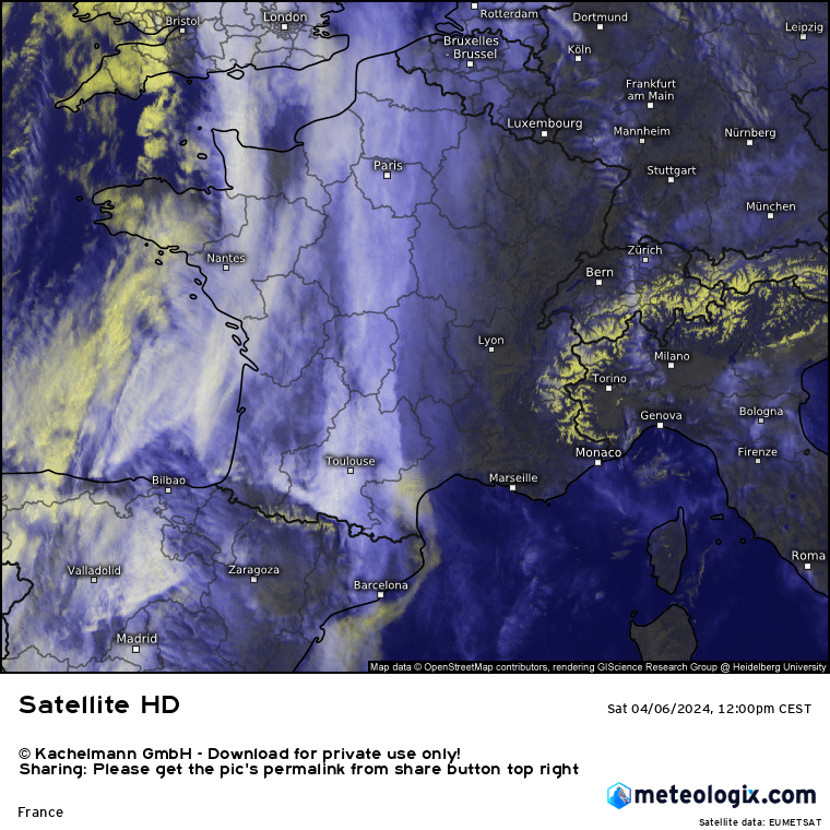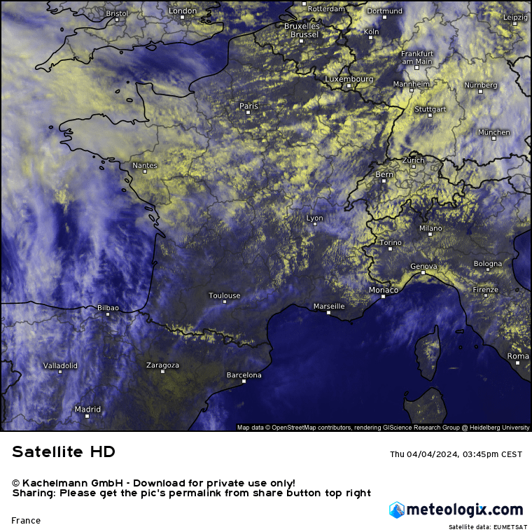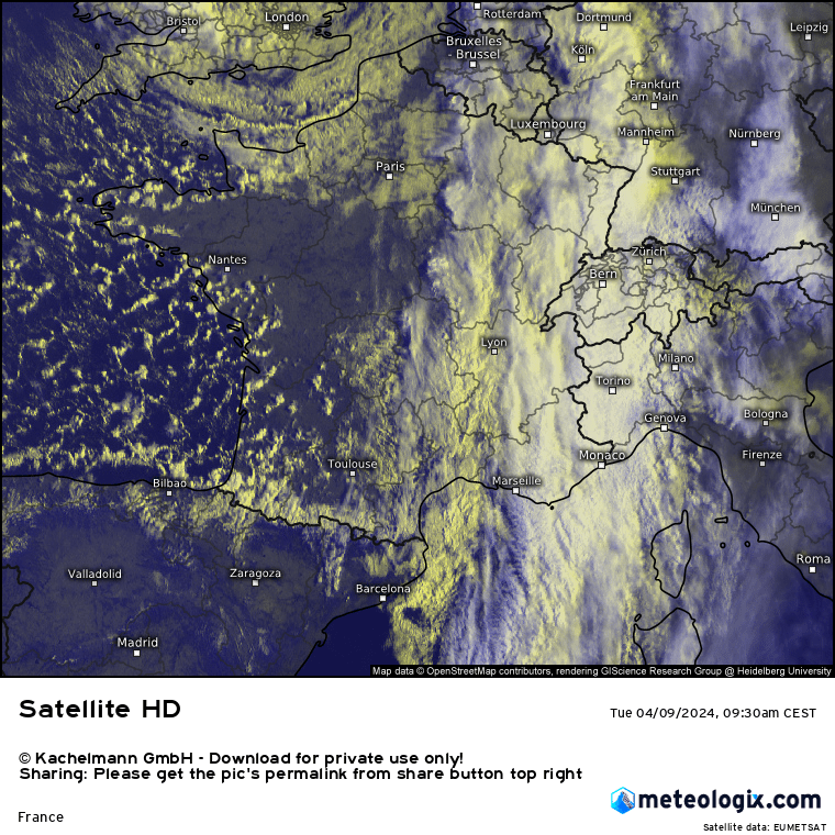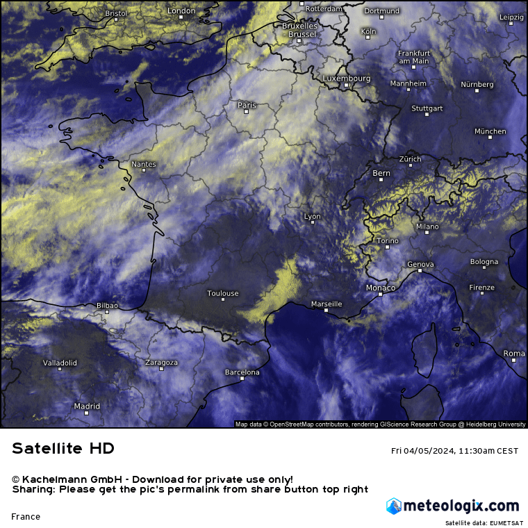 . Un talweg de faible longueur d’onde traverse le pays d’ouest en est en injectant un peu d’air froid d’altitude notamment dans l’est à l’arrière du front froid qui stationne encore en matinée en donnant quelques pluies de l’est au centre-est. A l’arrière, quelques averses se mettent en place, plus nombreuses dans l’est dans l’après-midi et pouvant être localement orageuses. Plus on va dans le sud-ouest ou le sud-est ainsi qu’en Corse, plus les éclaircies s’élargissent.