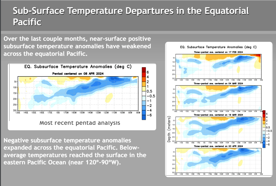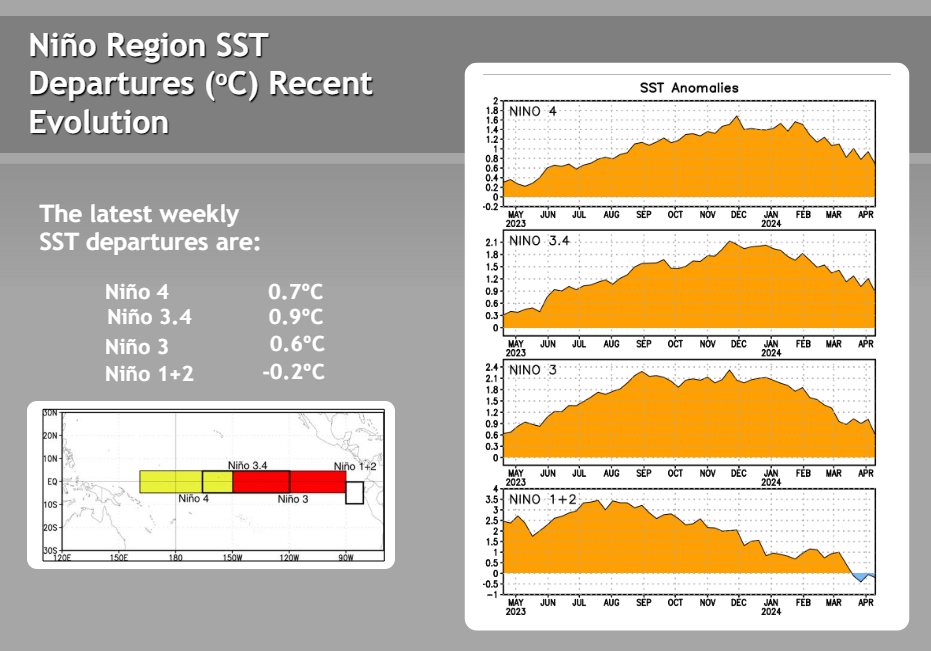 Le phénomène El Niño a continué de s’affaiblir dans l’est du Pacifique équatorial, mais les températures de l’air marin sont généralement restées à un niveau inhabituellement élevé.