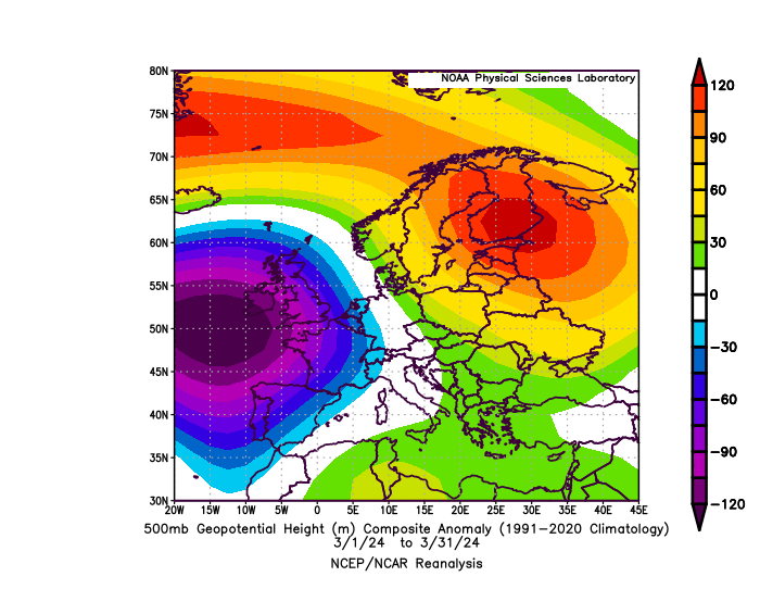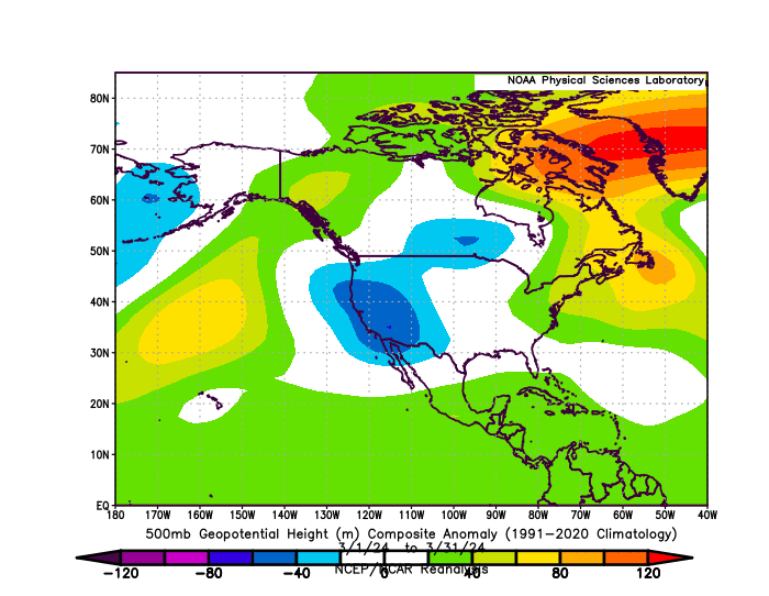 A l’échelle de l’hémisphère nord sur le mois entier de mars 2024, on a plus ou moins la continuité du marqueur de l’empreinte atmosphérique El Nino (même si les anomalies de SST positives sur le Pacifique Equatorial se résorbent) sur le continent américain avec dipole bas géopotentiels en allant vers le sud-ouest des USA et hauts géopotentiels en allant vers le nord-est du Canada.