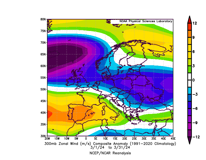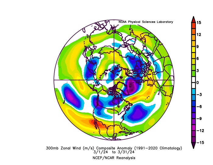 Les anomalies du courant jet à l’échelle de l’hémisphère sur mars 2024, montrent toujours plutôt une signature atmosphérique El Nino dynamisant un fort courant jet subtropical stationnant sur sud USA/nord Mexique. Le courant jet atlantique a circulé quant à lui bas en latitude sur l’Atlantique s’enfonçant en direction de la Méditerranée et favorisant des dégradations à répétition sur toute l’Europe de l’ouest. Configuration récurrente de doubles jets vers l’Europe centrale favorisant des vagues de douceur/chaleur à répétition. Même récurrence sur l’est du continent américain.